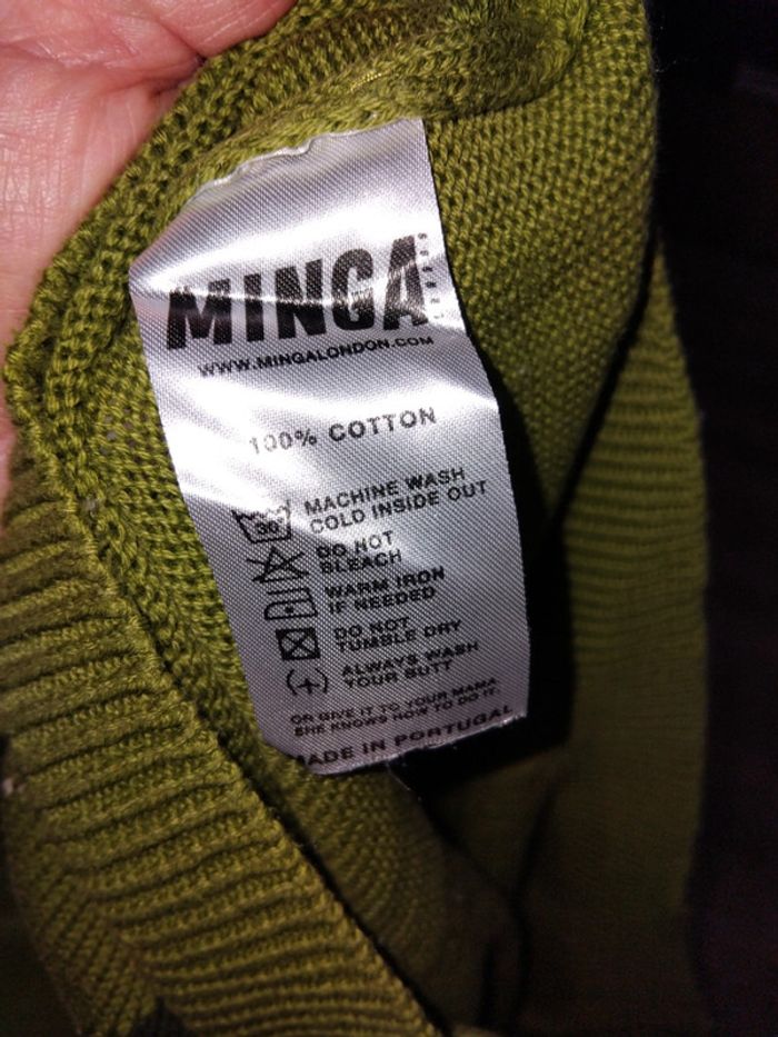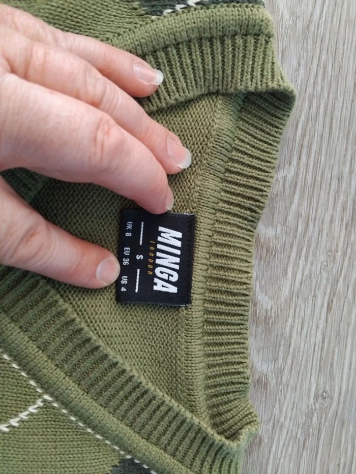Bonjour, je vends ce pull dans les tons de verts et beige de la marque Minga taille S en très bon état. Lavé maison non fumeur.
