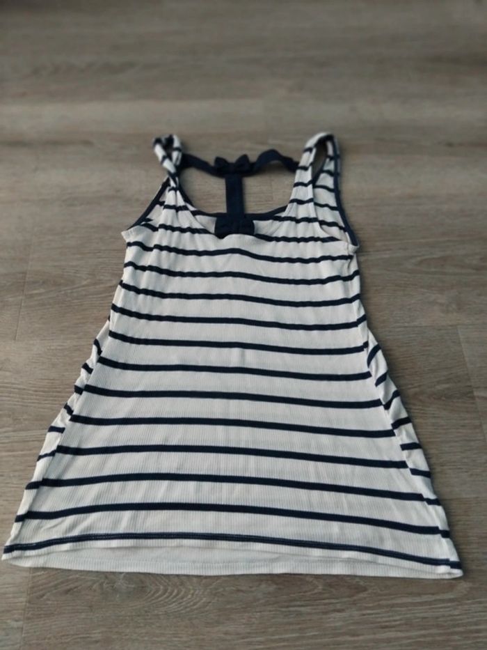 Bonjour, je vends ce débardeur rayé marine et blanc de la marque Premaman taille L en très bon état. Lavé maison non fumeur.