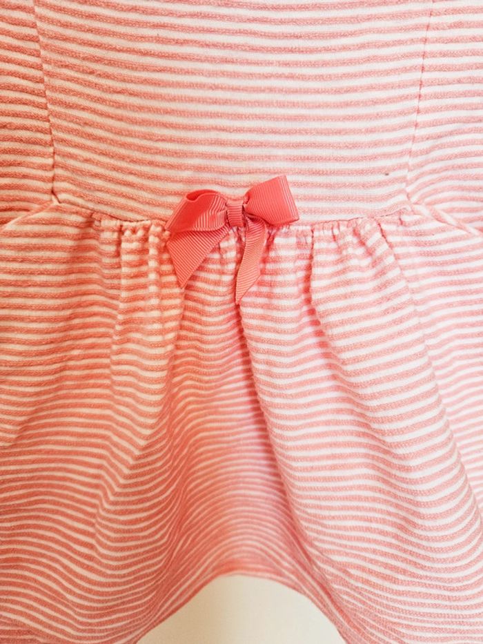 ● Robe d'été rose et blanche à rayures, avec un noeud.