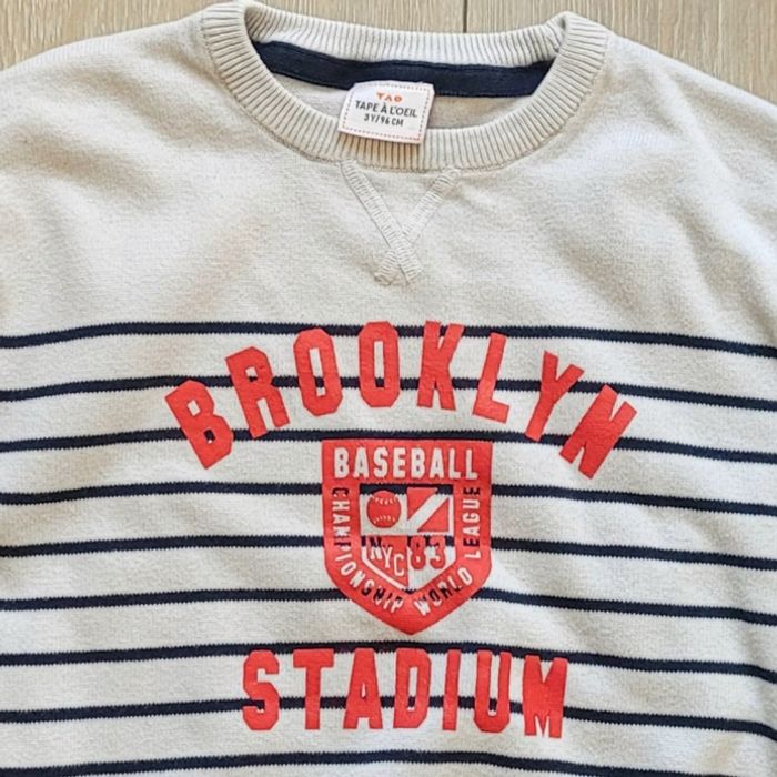 Pull fin crème rayé noir et écriture rouge. Garçon 3 ans. Marque Tape à l'oeil