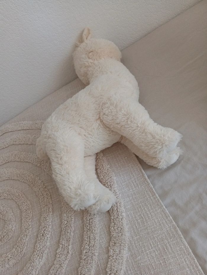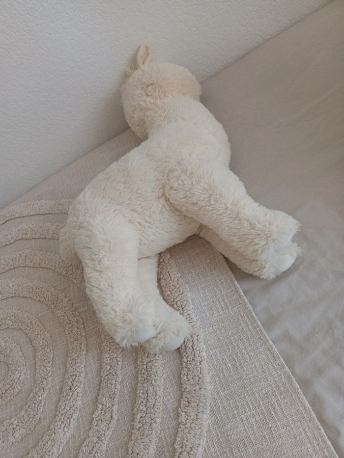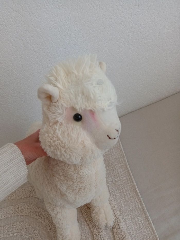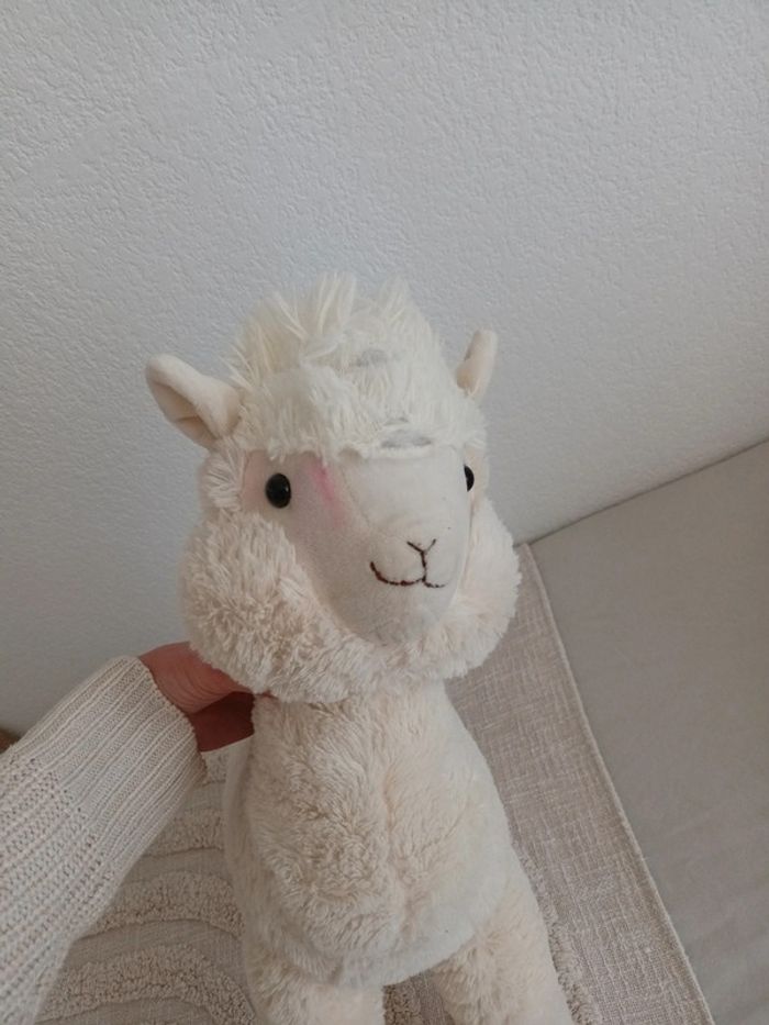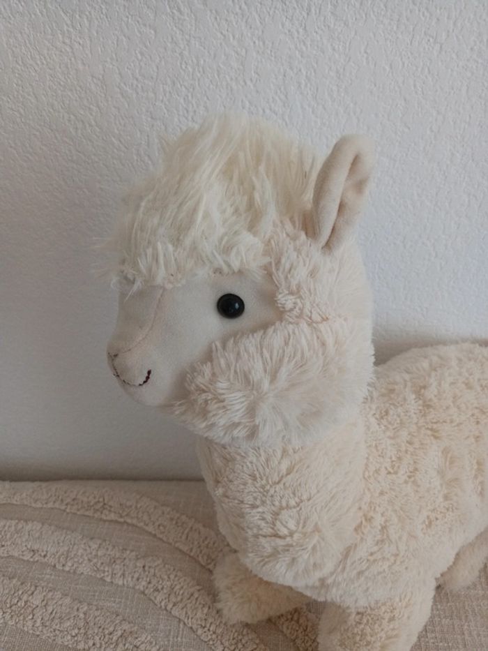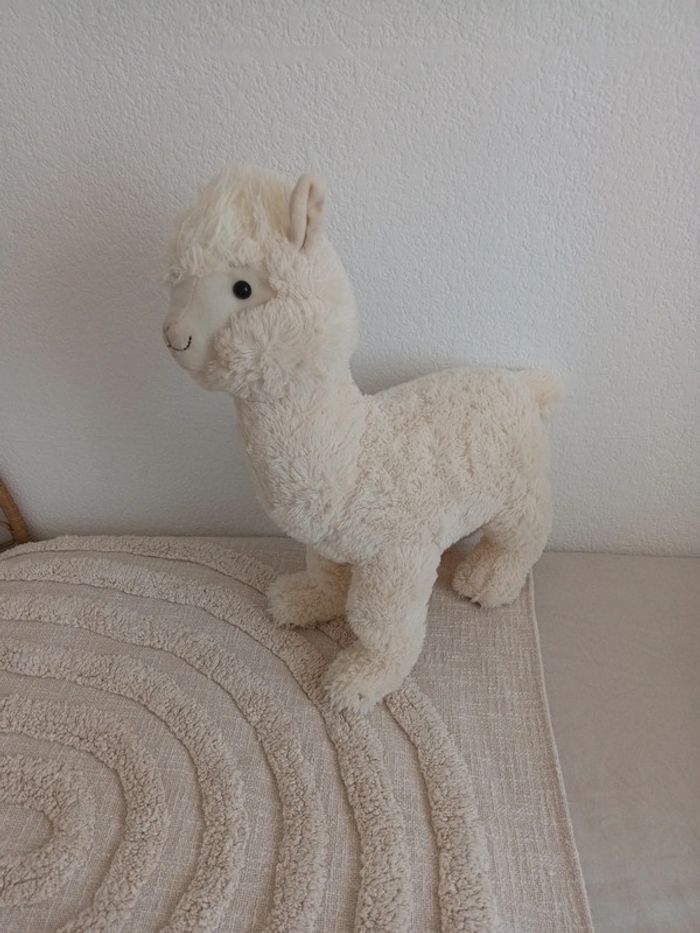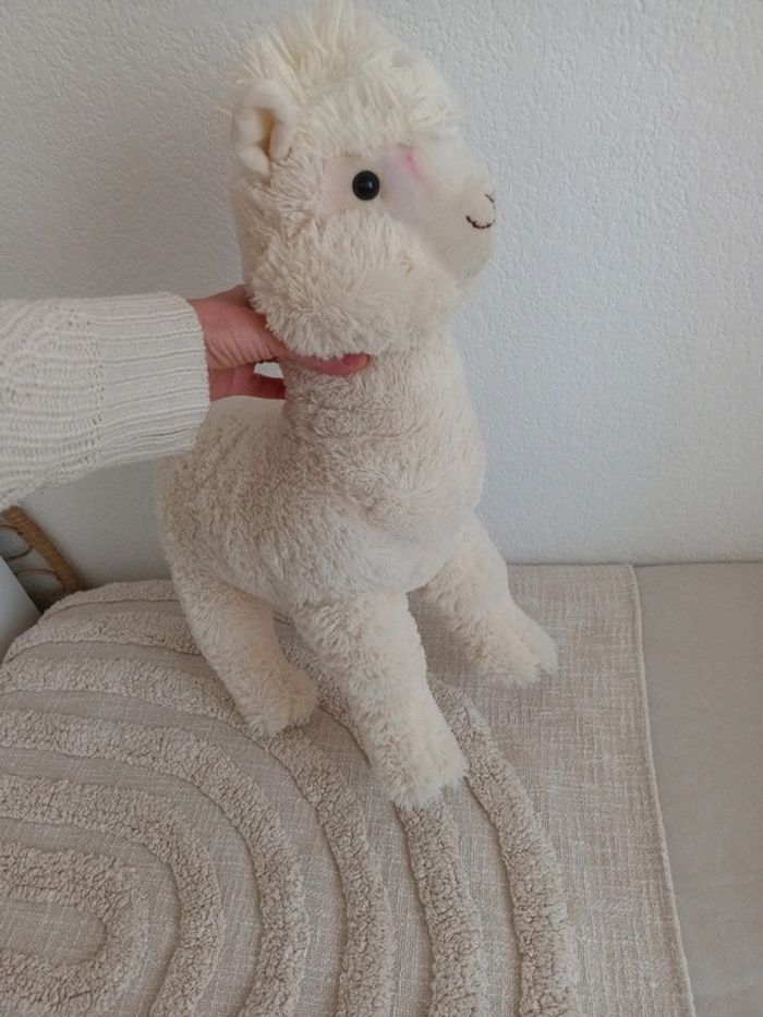 Peluche Lama blanc cassé crème hauteur 53 cm En très bon état mis à part les tâches de feutre que je n'ai pas essayé d'enlever et les 2 trous visibles en photos qui peuvent être recousus