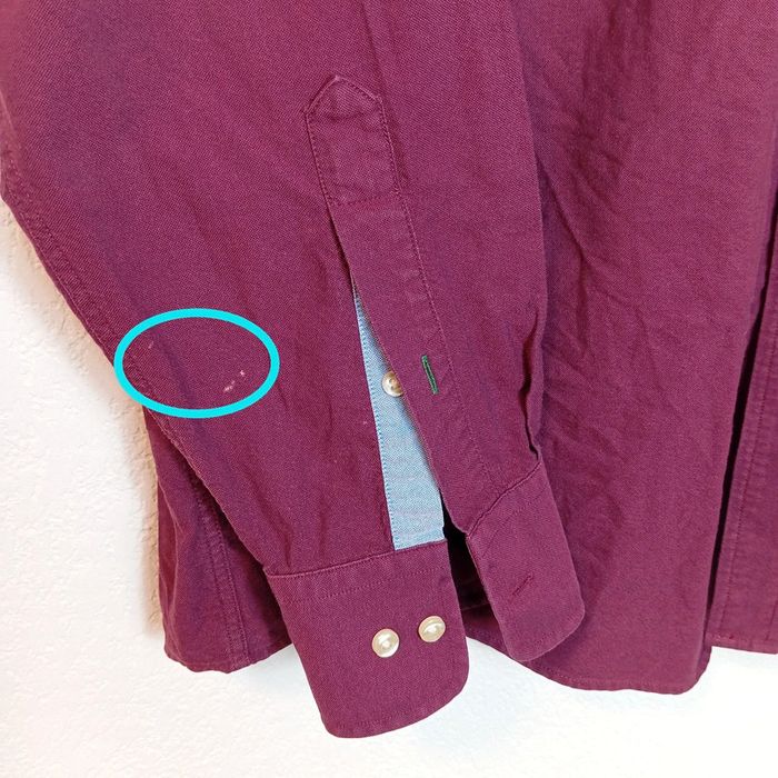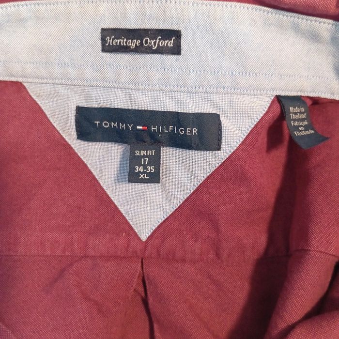 Chemise pour homme Tommy Hilfiger, modèle Heritage Oxford, coupe Slim Fit. Couleur : Bordeaux, chic et intemporelle 100% Coton Taille : XL (Col 17, manches 34-35) Cela correspond généralement à une taille française 44 / européenne 54, idéale pour un homme de grande taille avec un tour de cou de 43-44 cm et une carrure large, tout en gardant une coupe ajustée. Tissu de qualité, agréable à porter Parfaite pour un look habillé ou casual chic En très bon état général, sauf une petite décoloration dans la Manche (voir photo)