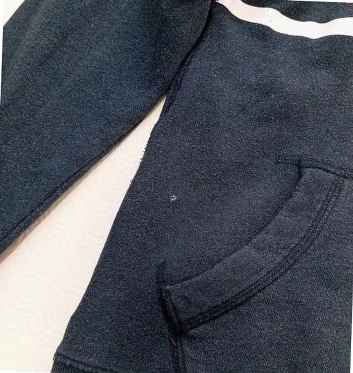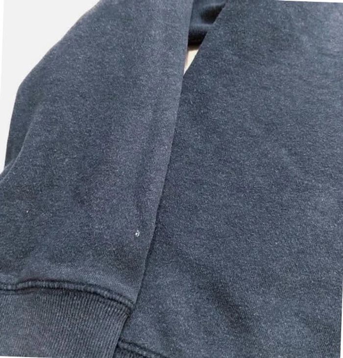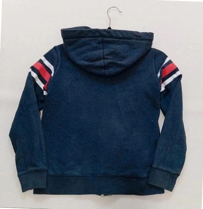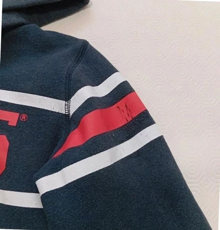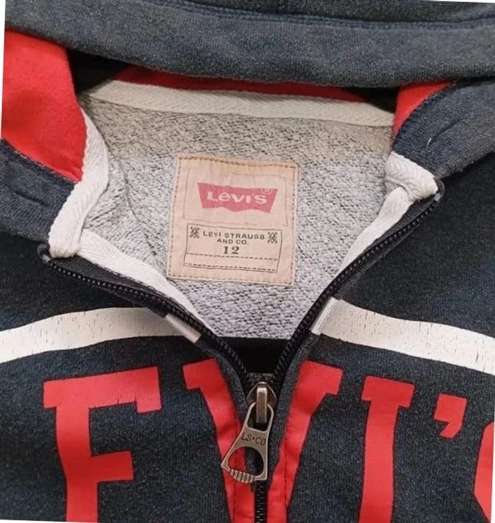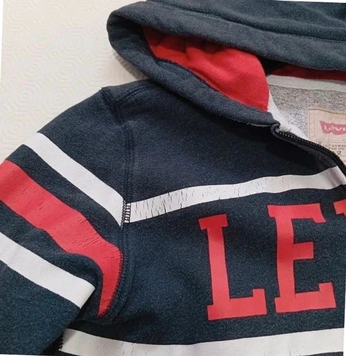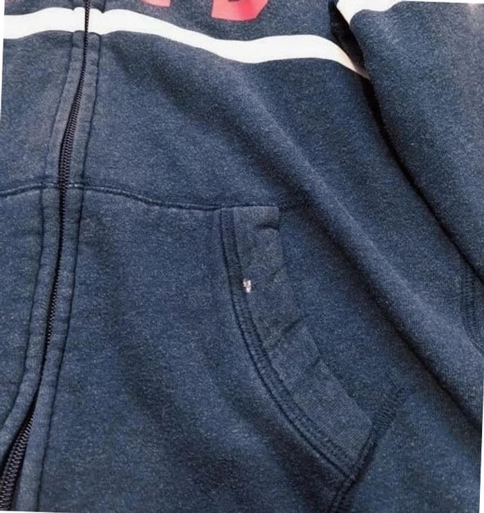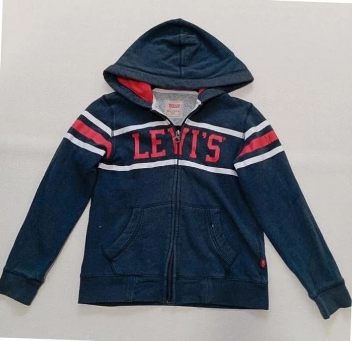 Sweat a Capuche Zippé Marque Levi's Couleur Bleu Marine Taille 12 ans 100% coton Le sweat est d'occasion et présente signes d'usure. - Une tâche noir sur l'épaule gauche. (Voir photos) - Des petits trous (Voir photos) - Impression craquelée (Voir photos)