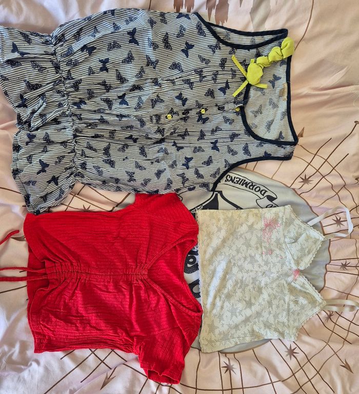 Chemisier bleu motif papillon orchestra 12 ans Débardeur court sans marque Tee shirt rouge court sans marque Le tout 2e