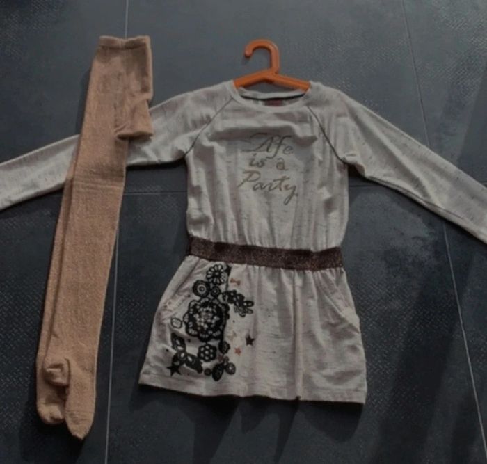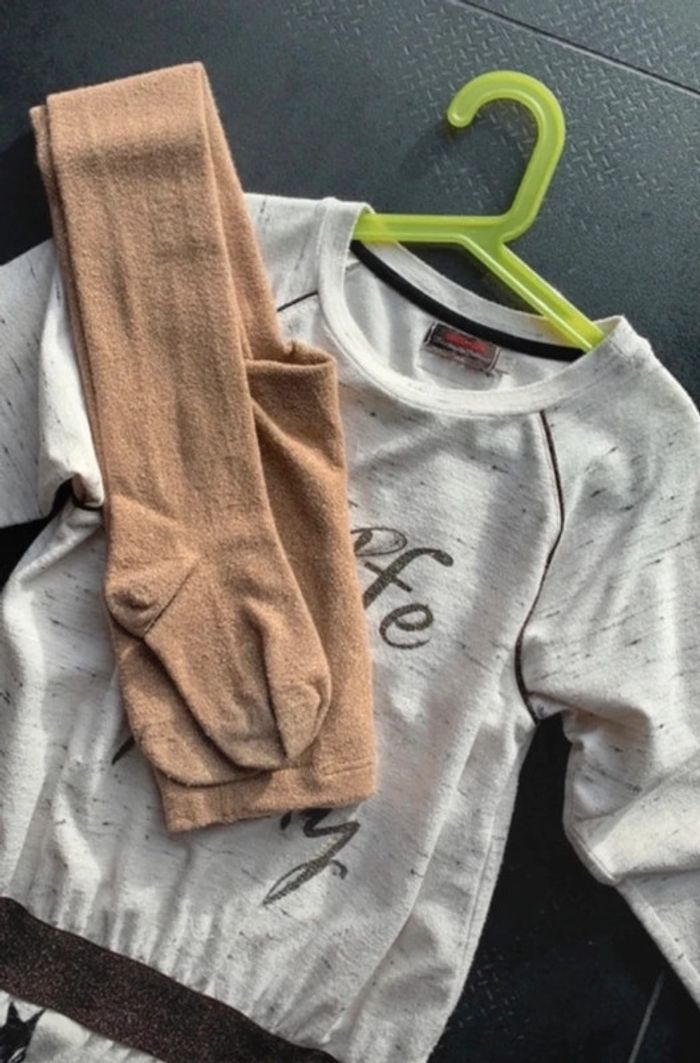 Robe CATIMINI Beige avec motifs fleurs velours noir Collants assortis Très bon état Propre Maison non fumeur
