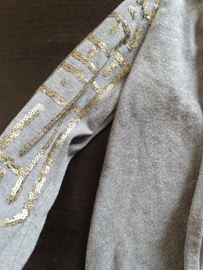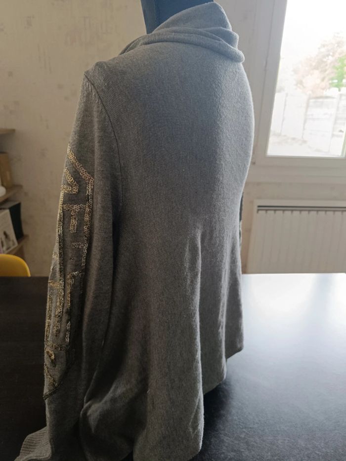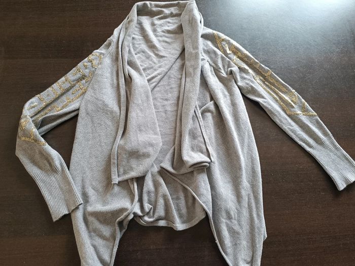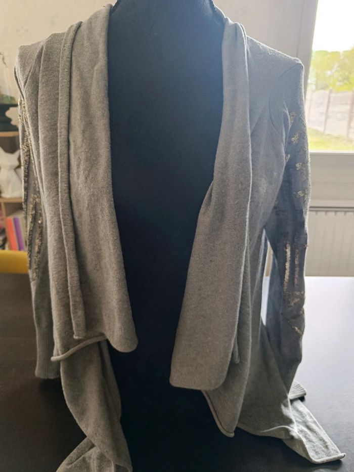 Gilet gris Manches longues Sequins dorés sur les manches Découpe asymétrique (+ long devant) 70% Viscose & 30% Polyamide TAILLE S TRES BON ETAT Allez voir mes autres ventes!