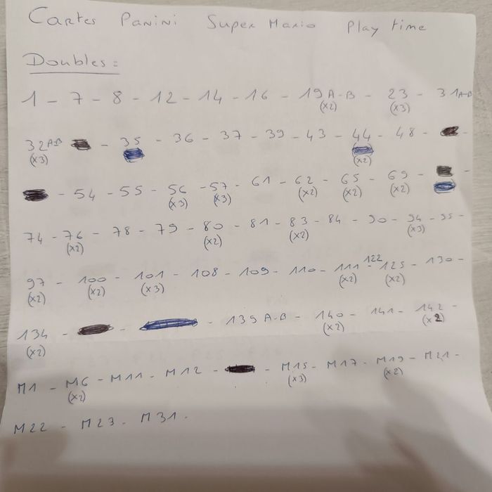 Stickers panini super Mario Playtime. Nos doubles : 1-7-8-12-14-16-19A.B-19A.B-23-23-23-31A.B- 32A.B-32A.B-32A.B-35-36-37-39-43-44-44-48-54-55-56-56-56-57-57-57-61-62-62-65-65-69-69-74-76-76-78-79-80-80-81-83-83-84-90-94-94-94-95-97-97-100-100-101-101-101-108-109-110-111-111-122-125-125-130-134-134-139A.B-140-140-141-142-142-M1- M6-M6-M11-M12-M15-M15-M15-M17-M19-M19-M21-M22-M23- M31. O.25cts l'unité. N'hésitez pas à me contacter afin que je vous prépare une annonce avec les numéros qui vous conviennent. Envoi postal possible avec paiement PayPal. Liste mise à jour au fur et à mesure donc tout est disponible.