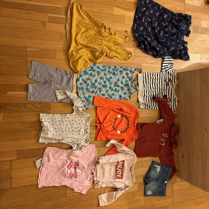 Lot vêtements filles 6ans très bon état toutes marque. 3robes 3pulls (pull enjoy 5ans) 2tee short ml 1tee short mc 1short 1legging cycliste 10€