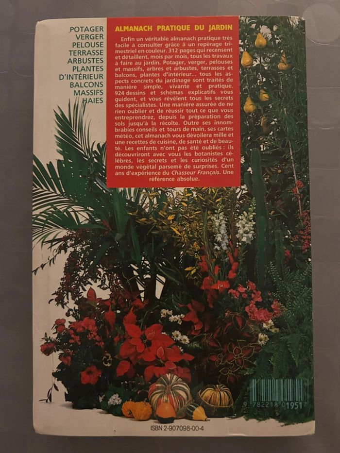 ALMANACH PRATIQUE DU JARDIN Enfin un véritable almanach pratique très facile à consulter grâce à un repérage trimestriel en couleur. 312 pages qui recensent et détaillent, mois par mois, tous les travaux à faire au jardin. Potager, verger, pelouses et massifs, arbres et arbustes, terrasses et balcons, plantes d'intérieur tous les aspects concrets du jardinage sont traités de manière simple, vivante et pratique. 924 dessins et schémas explicatifs vous guident, et vous révélent tous les secrets des spécialistes. Une manière assurée de ne rien oublier et de réussir tout ce que vous entreprendrez, depuis la préparation des sols jusqu'à la recolte. Outre ses innombrables conseils et tours de main, ses cartes météo, cet almanach vous dévoilera mille et une recettes de cuisine, de santé et de beau-te. Les enfants n'ont pas ete oubliés: ils découvriront avec vous les botanistes cé-lebres, les secrets et les curiosités d'un monde végétal parsemé de surprises. Cent ans d'expérience du Chasseur Français. Une réference absolue.