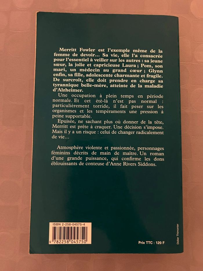 Merritt Fowler est l'exemple même de la femme de devoir... Sa vie, elle l'a consacrée pour l'essentiel à veiller sur les autres : sa jeune sœur, la jolie et capricieuse Laura ; Pom, son mari, un médecin au grand cœur ; Glynn enfin, sa fille, adolescente charmante et fragile. De surcroît, elle doit prendre en charge sa tyrannique belle-mère, atteinte de la maladie d'Alzheimer. Une occupation à plein temps en période normale. Et cet été-là n'est pas normal : paraisiere ne tormeramena pe pression a peine supportable. Epuisée, ne sachant plus où donner de la tête, Merritt est prête à craquer. Une décision s'impose. Mais il y a un risque : celui de changer radicalement de vie... Atmosphère violente et passionnée, personnages féminins décrits de main de maître. Un roman d'une grande puissance, qui confirme les dons éblouissants de conteuse d'Anne Rivers Siddons.