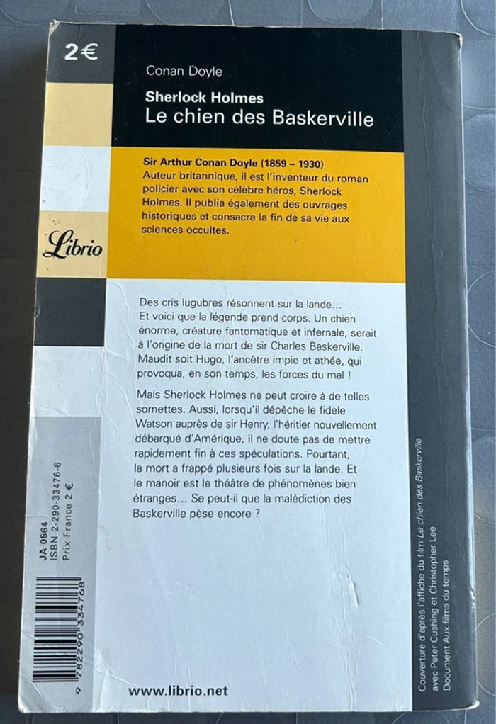 Conan Doyle Sherlock Holmes Le chien des Baskerville Librio Sir Arthur Conan Doyle (1859 - 1930) Auteur britannique, il est l'inventeur du roman policier avec son célèbre héros, Sherlock Holmes. Il publia également des ouvrages historiques et consacra la fin de sa vie aux sciences. Des cris lugubres résonnent sur la lande... Et voici que la légende prend corps. Un chien énorme, créature fantomatique et infernale, serait à l'origine de la mort de sir Charles Baskerville. Maudit soit Hugo, l'ancêtre impie et athée, qui provoqua, en son temps, les forces du mal ! Mais Sherlock Holmes ne peut croire à de telles sornettes. Aussi, lorsqu'il dépêche le fidèle Watson auprès de sir Henry, l'héritier nouvellement débarqué d'Amérique, il ne doute pas de mettre rapidement fin à ces spéculations. Pourtant, la mort a frappé plusieurs fois sur la lande. Et le manoir est le théâtre de phénomènes bien étranges... Se peut-il que la malédiction des Baskerville pèse encore ? Couverture d'après l'affiche du film Le chien des Baskerville avec Peter Cushing et Christopher Lee Document Aux films du temps