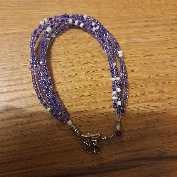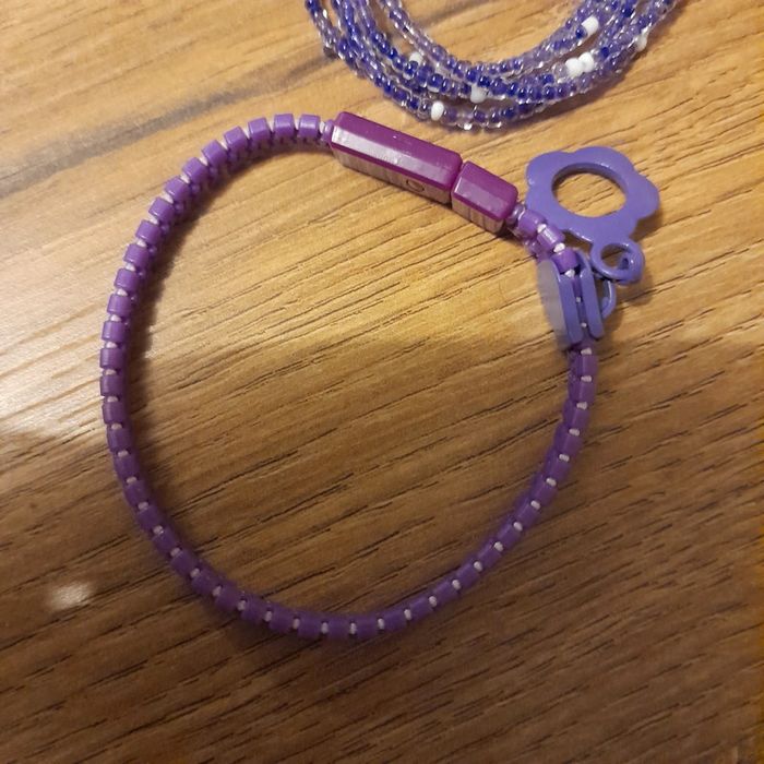 Lot de 2 bracelets violet : - un bracelet en perles de rocaille en plusieurs rangs. - un bracelet plastique comme une fermeture éclair.
