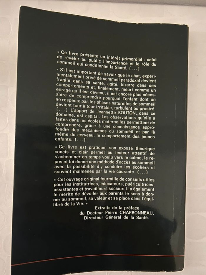 « Ce livre présente un intérêt primordial: celui de révéler au public l'importance et le rôle du sommeil qui conditionne la Santé. (...) " S'il est important de savoir que le chat, expérimentalement privé de sommeil paradoxal devient fragile dans sa santé, agité, bizarre dans ses comportements et, finalement, meurt comme un enragé qu'il est devenu, il est encore plus nécessaire de comprendre pourquoi l'enfant dont on ne respecte pas les phases naturelles de sommeil devient tour à tour irritable, turbulent ou prostré. (...) L'apport de Jeannette BOUTON, dans ce domaine, est capital. Les observations qu'elle a faites dans les écoles maternelles permettent de comprendre, grâce à une connaissance approfondie des mécanismes du sommeil et par là même du cerveau, le comportement des jeunes enfants. (...) « Ce livre est pratique, son exposé théorique concis et clair permet au lecteur attentif de s'acheminer en temps voulu vers le calme, le repos et lui donne une méthode d'accès au sommeil avec la possibilité d'y conduire les écoliers si souvent malmenés par la vie courante. (...) « Cet ouvrage original fourmille de conseils utiles pour les institutrices, éducateurs, puéricultrices. assistantes et travailleurs sociaux. Il a également le mérite de dévoiler aux parents le sens à donner au sommeil, sa valeur et sa place dans l'équilibre de la Vie. » Extraits de la préface du Docteur Pierre CHARBONNEAU, Directeur Général de la Santé.
