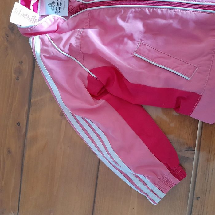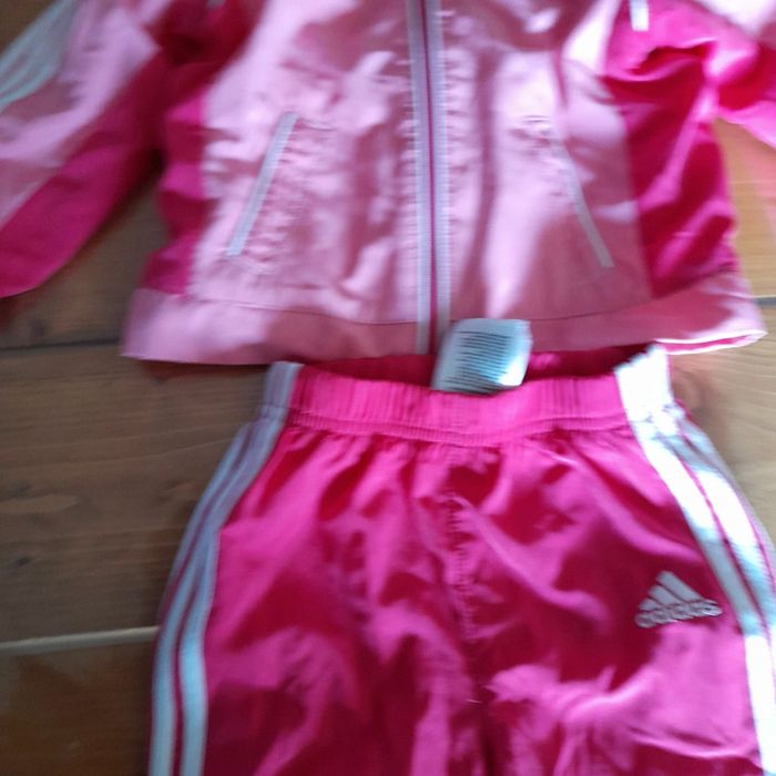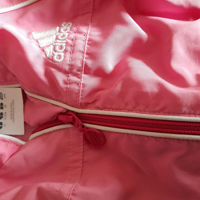 Ensemble adidas composé de la veste et eu pantalon, taille 12 mois, couleur rose clair et rose foncé.