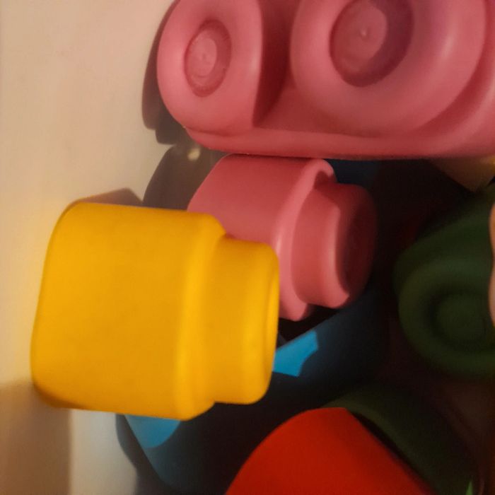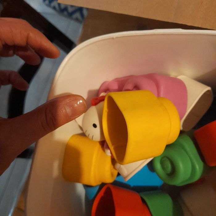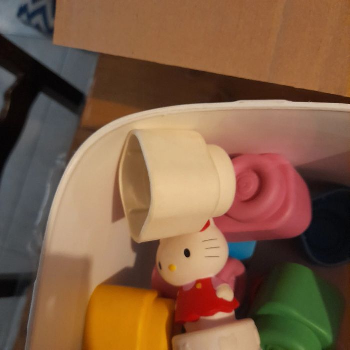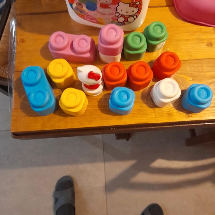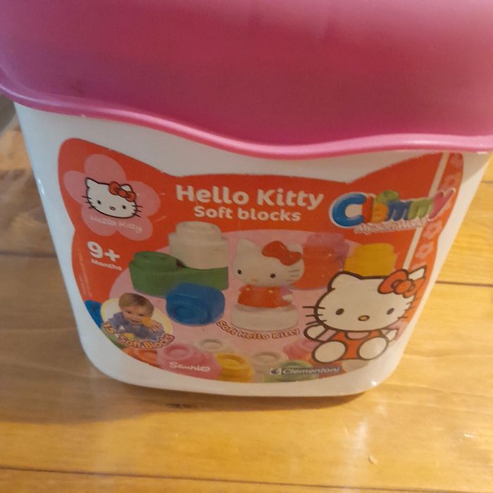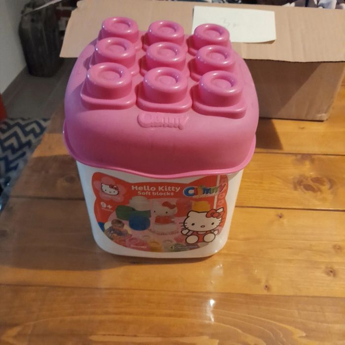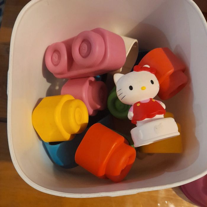 Bloc de construction souple climy complet à partir de 9 mois, 15 pièces dont le personnage kitty + boîte de rangement en bon état, les pièces et la boîte montrent trace d'usure (tâches voir photos).