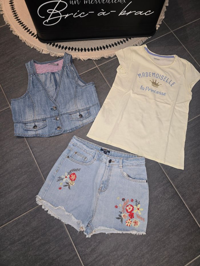 Bonjour 👋 Je vend ce : 👉 t-shirt vertbaudet 12 ans Jaune mademoiselle princesse 👉 short kiabi 12 ans Jean bleu a fleurs 👉 bolero tape à l'œil 12 ans Jean bleu Maison 🏠 non fumeur et sans animaux