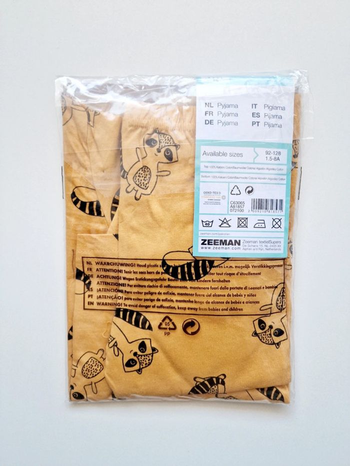 Tous mes articles Zeeman : #zeemansev Tous mes pyjamas : #pyjamasev Tous mes habits ♂️ 2 ans : #2anssevgarcon 🚨 Prix fixe Pyjama deux pièces, manches longues + pantalon Marque : ZEEMAN Couleur : jaune moutarde Motif : raton laveur Taille : 1,5/2 ans - 92 cm État : neuf dans son emballage d'origine 100% coton Oeko-Tex Retrait sur place ou envoi.