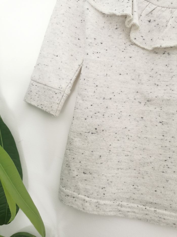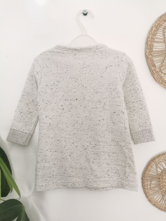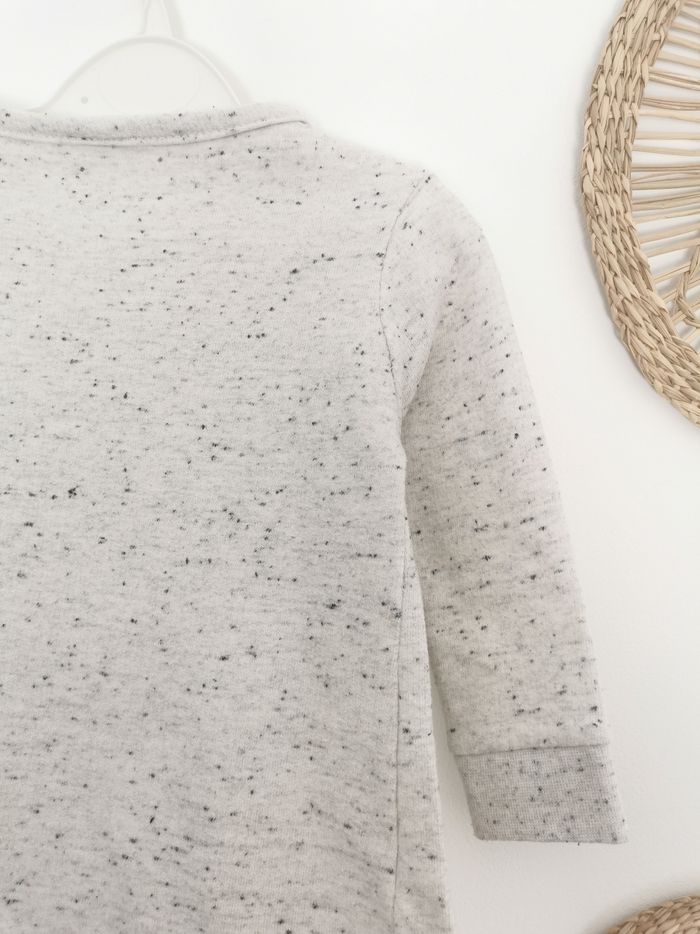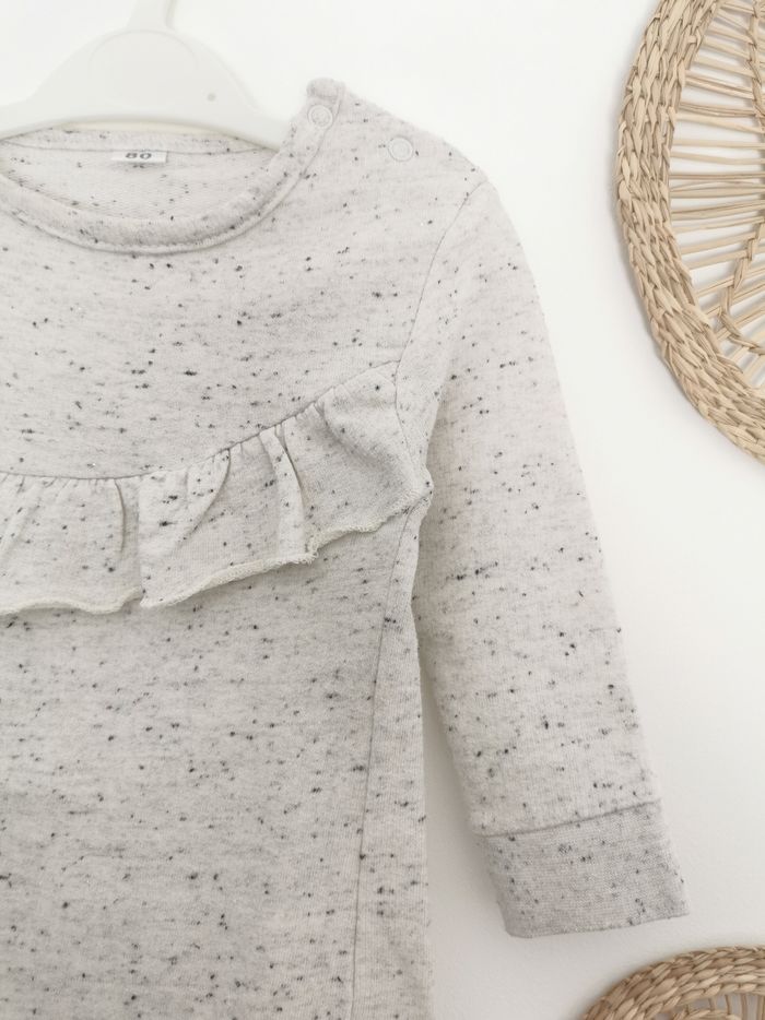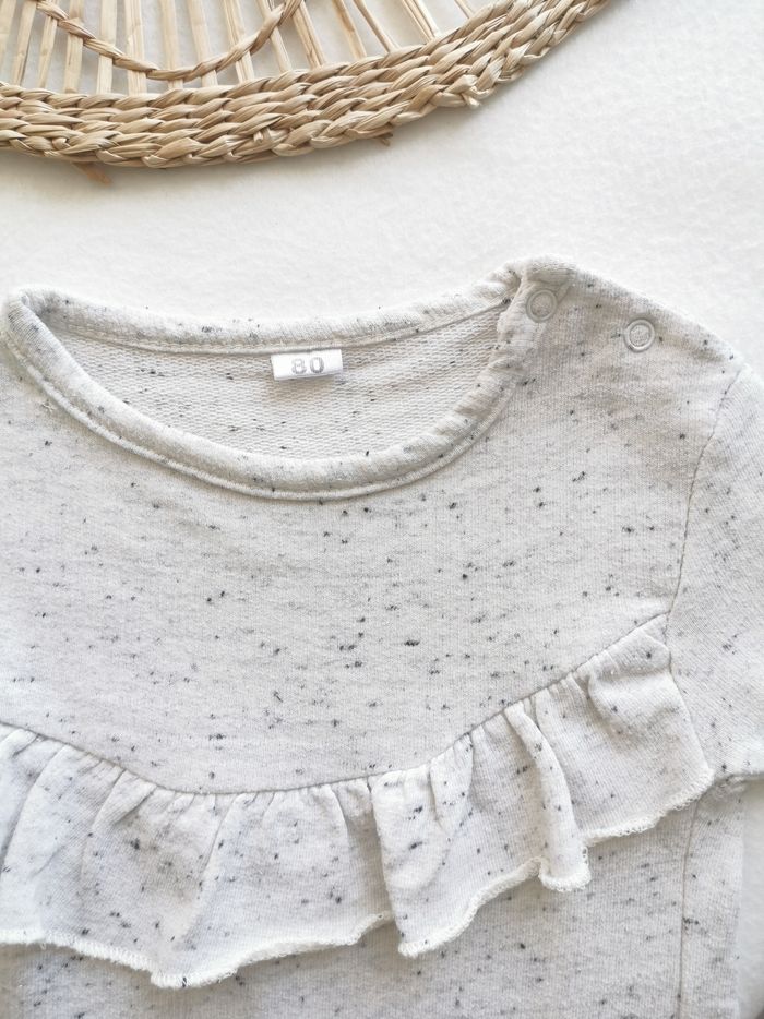 👧 Tunique mouchetée 👧 Zeeman 🖊️ ÉTAT ✅️: Bon, sans tâche ni trou 🖊️ DESCRIPTION: ▪️Taille 12/18 Mois - 80 cm ▪️Matière: 50% coton - 50% polyester ▪️Col rond ▪️Volant sur la poitrine ▪️Manches longues ▪️Ouverture par 2 boutons pression 🔘🔘 sur l'épaule gauche ▪️Couleur: Gris moucheté