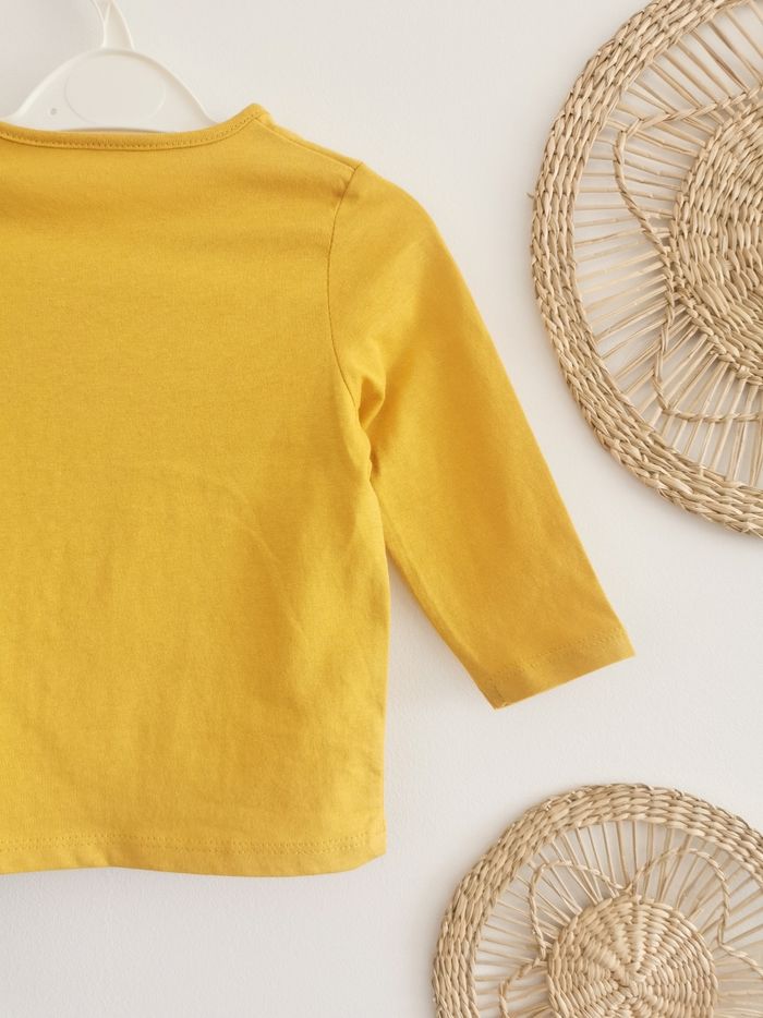 👧 Tee-shirt moutarde "Amour" 👧 Kiabi 🖊️ ÉTAT ✅️: Parfait👌 - Avec étiquette 🏷️ - Jamais porté🆕 🖊️ DESCRIPTION 👕: ▪️Taille 12 Mois - 73/76 cm ▪️Matière: 100% coton ▪️Col rond ▪️Manches longues ▪️Ouverture par 2 boutons 🔘🔘 sur l'épaule gauche ▪️Inscription "AMOUR" à paillettes ✨ dorées 🟡 sur la poitrine ▪️Couleur: Jaune moutarde 🟡 💜