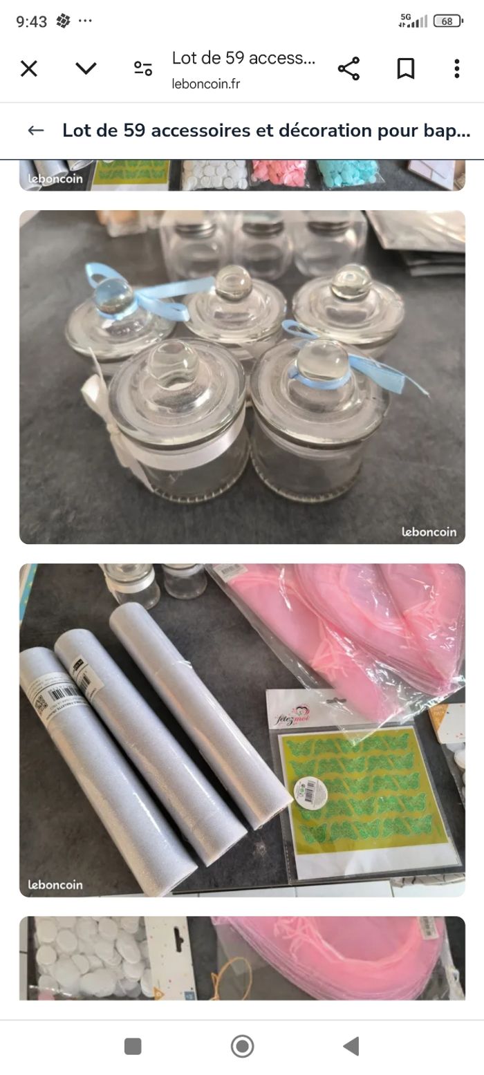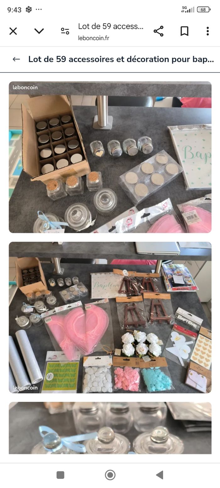 Lot d' accessoires pour baptême ou baby shower Tout est neuf , la plupart encore emballé et étiqueté Nappe, fleur artificielle, pot en verre , support , livre , sequin , confettis, étiquettes...... Plus d' infos sur demande