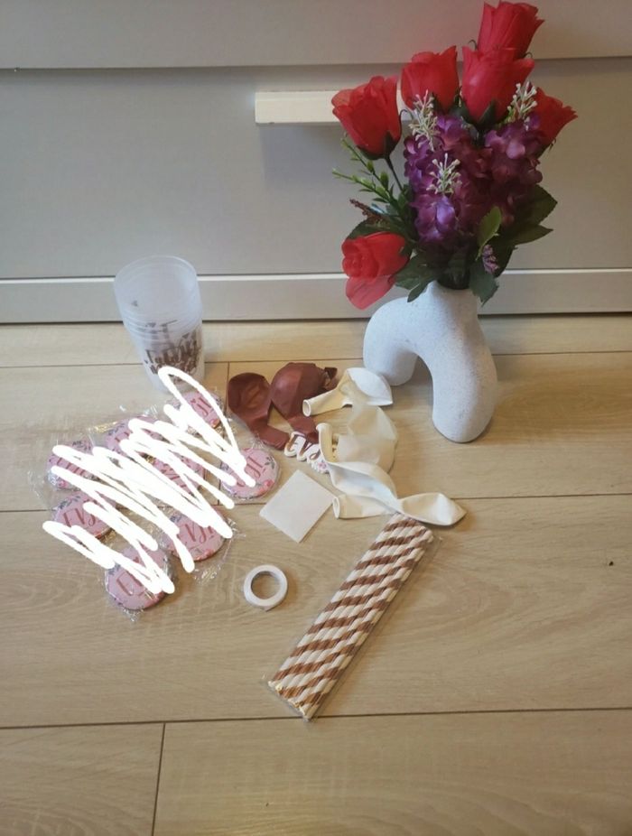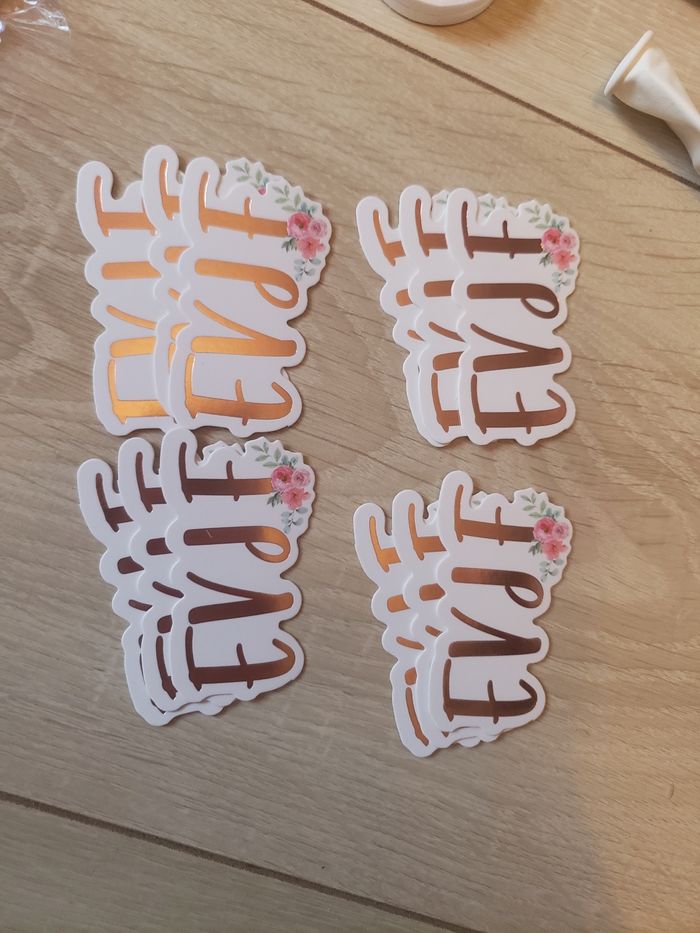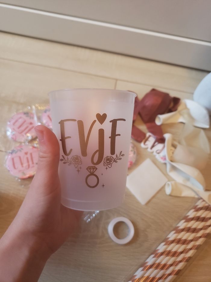 Lot de 41 accessoires EVJF 🎀 sous blister jamais servi - Les pins ne sont plus disponibles - 6 verres "EVJF" jamais servi (voir photos 4 et 5) - 3 ballons rouges bordeaux, 3 ballons blancs, 2 ballons transparents avec des confettis à l'intérieur jamais servi (voir photo 6) - 2 rouleaux de "scotch" pour les ballons jamais servi (voir photo 7) - 12 accessoires "EVJF" pour les pailles à coller avec la colle prévue jamais servi (voir photos 8 et 9) - 13 pailles en carton rose gold et blanche jamais servi (voir photo 10)