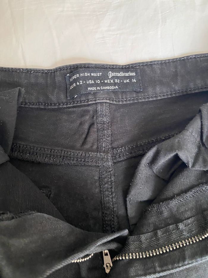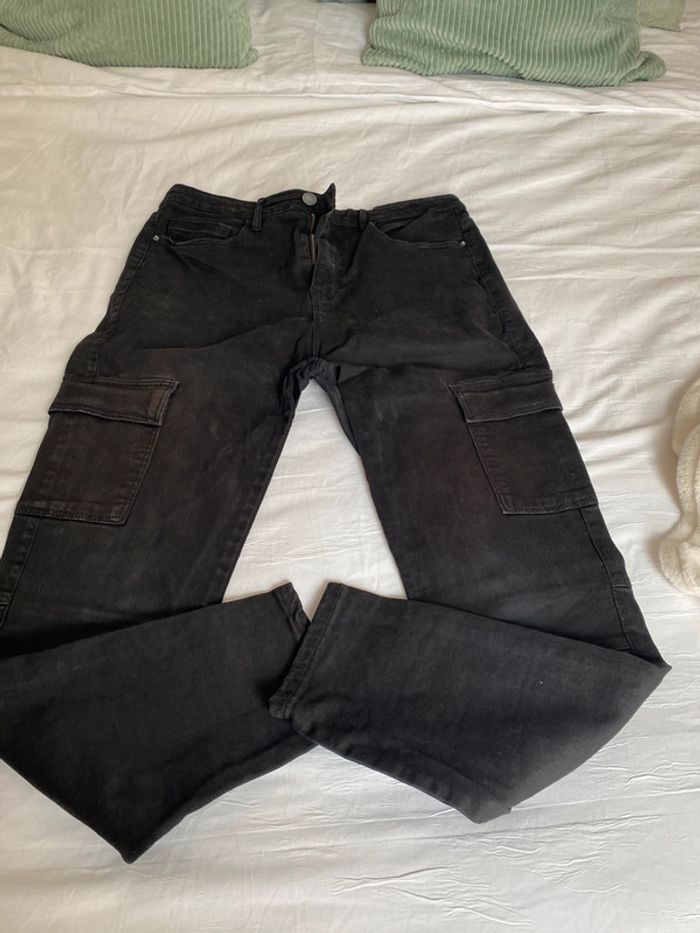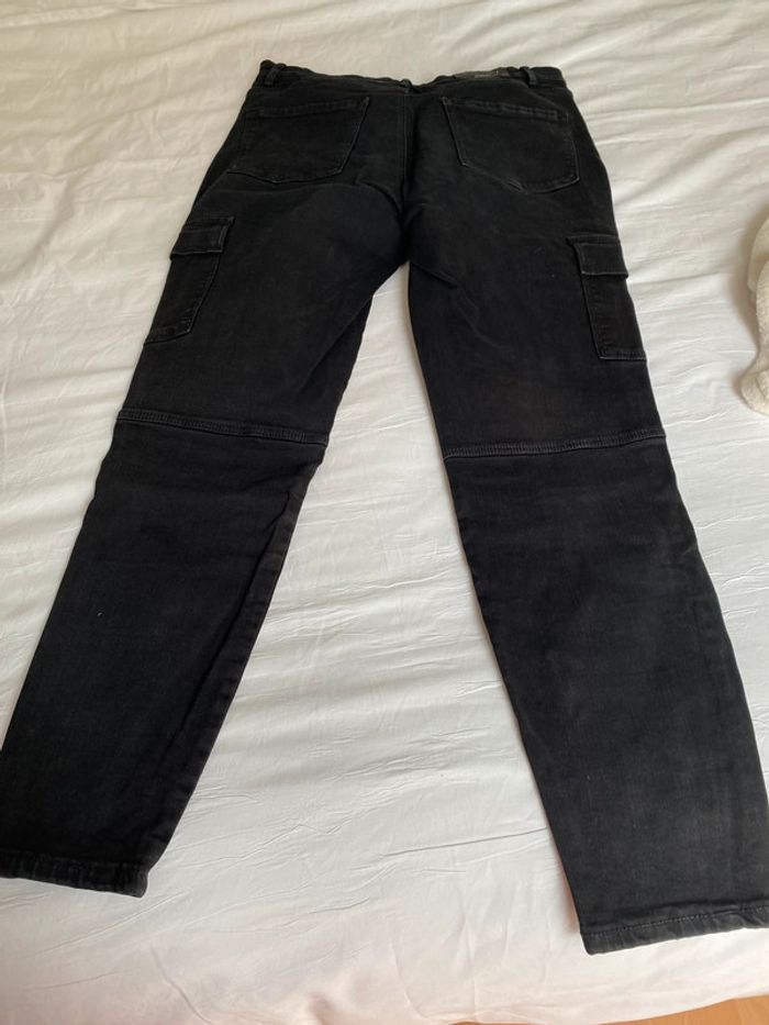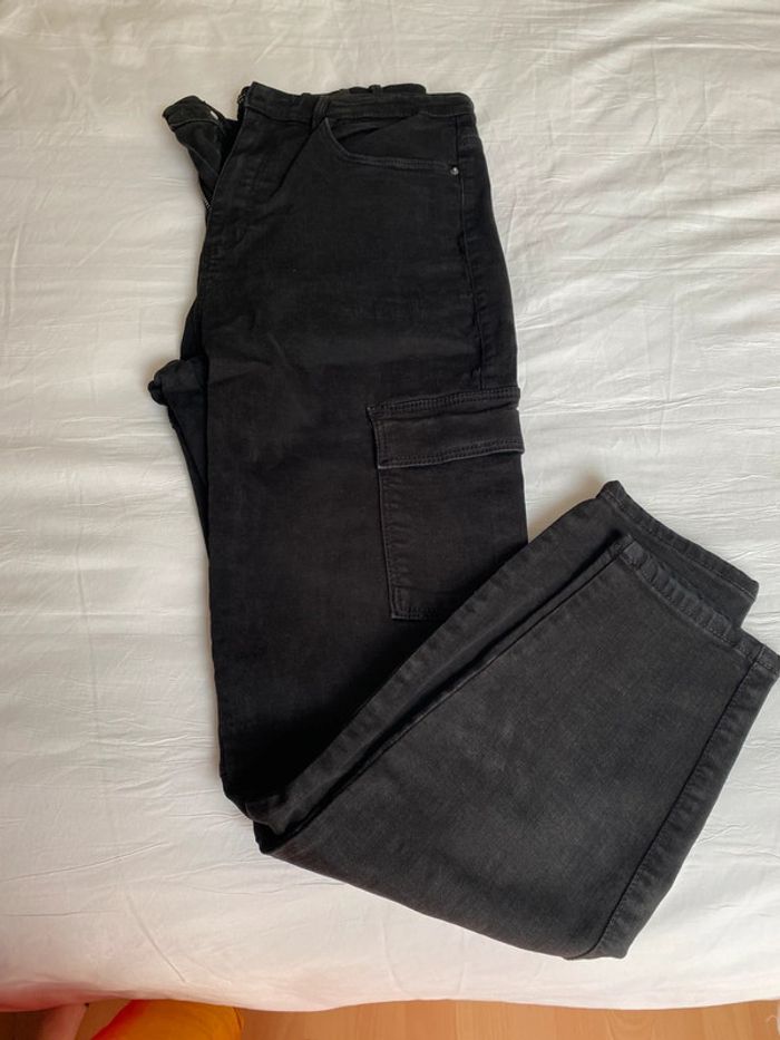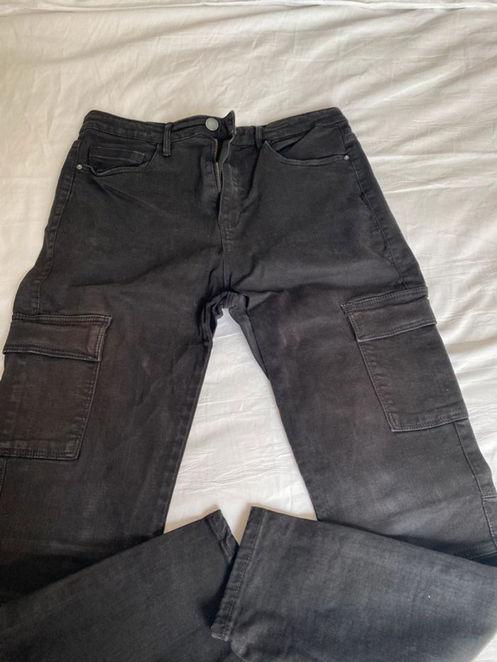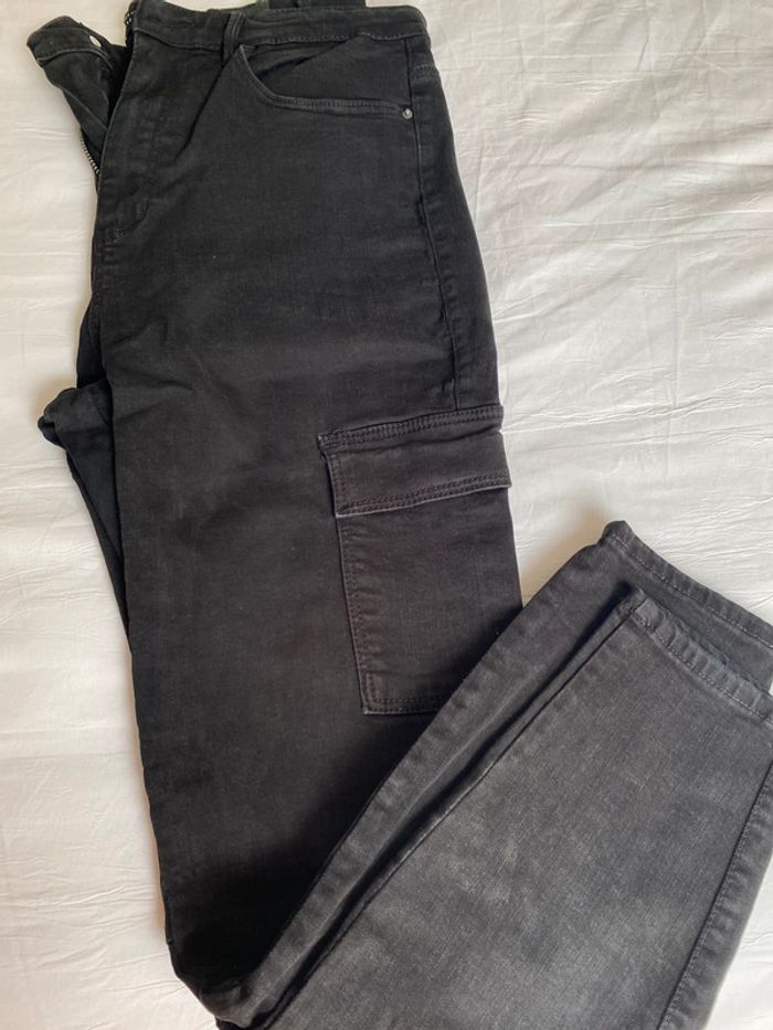 Jeans pour femme modèle cargo avec plusieurs poches en très bon état couleur noir juste sur quelque photos en dirait gris foncés mais il est bien noir taille 42