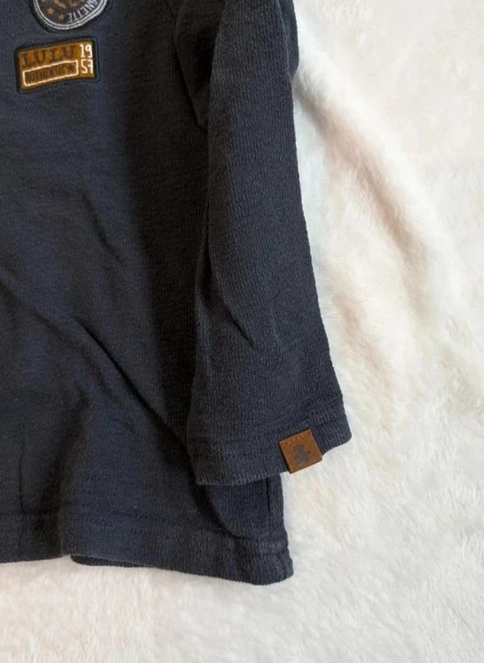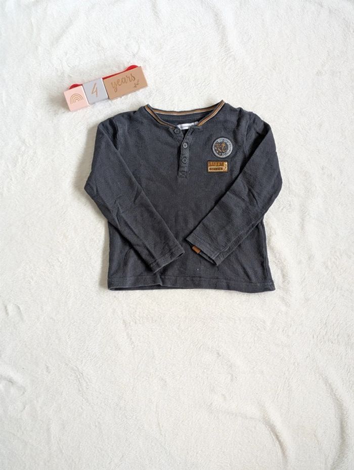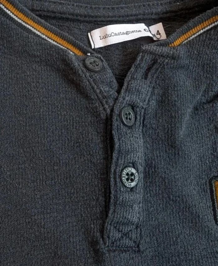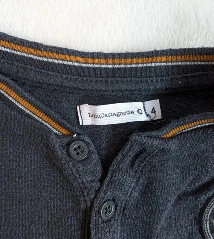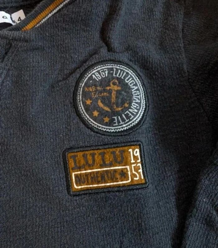 ✏️𝗗𝗲𝘀𝗰𝗿𝗶𝗽𝘁𝗶𝗼𝗻: Pull en maille fine (idéal pour mi-saison, printemps, automne ou soirées fraiches d'été) avec bouton au niveau du col. Il est gris foncé avec liseré marron et blanc au col et écusson au niveau de la manche droite. Il à été peut porté et donc en très bon état.