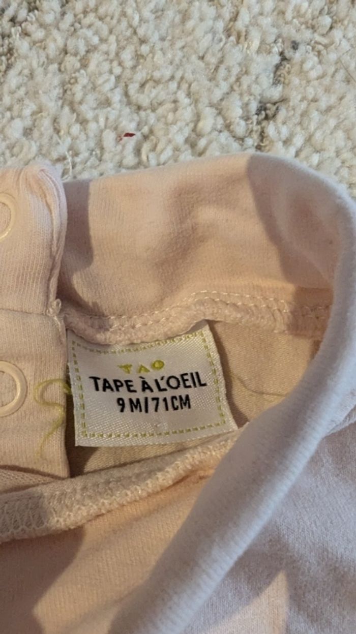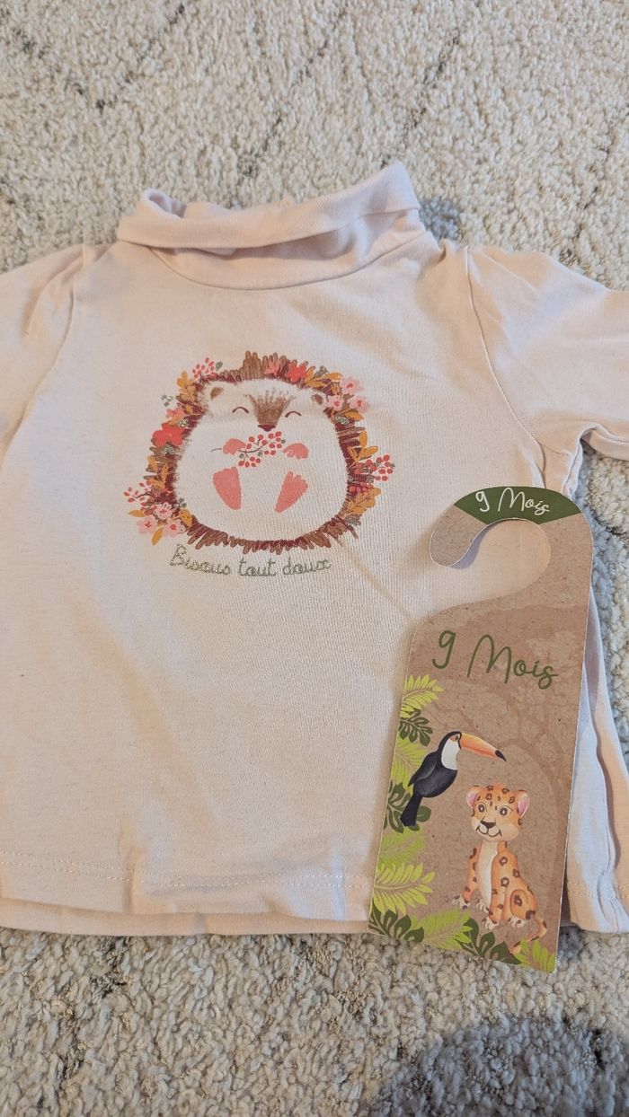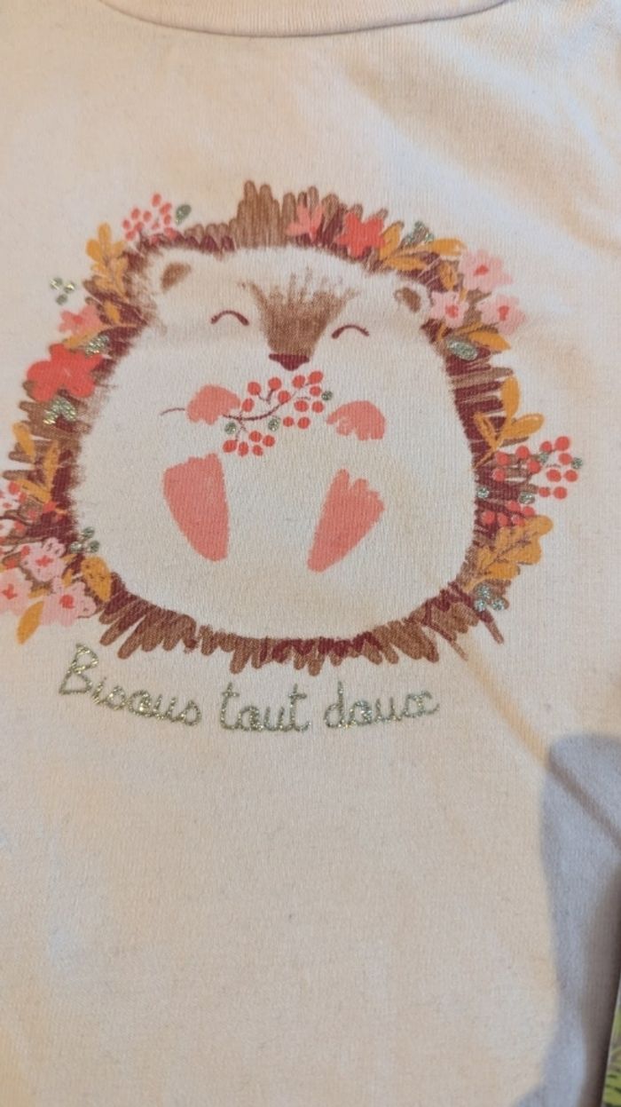 T-shirt col roulé manche longue rose pâle en coton et elasthanne Tape à l'oeil. Motif hérisson et inscription " Bisous tout doux". Fermeture à pression dans le dos