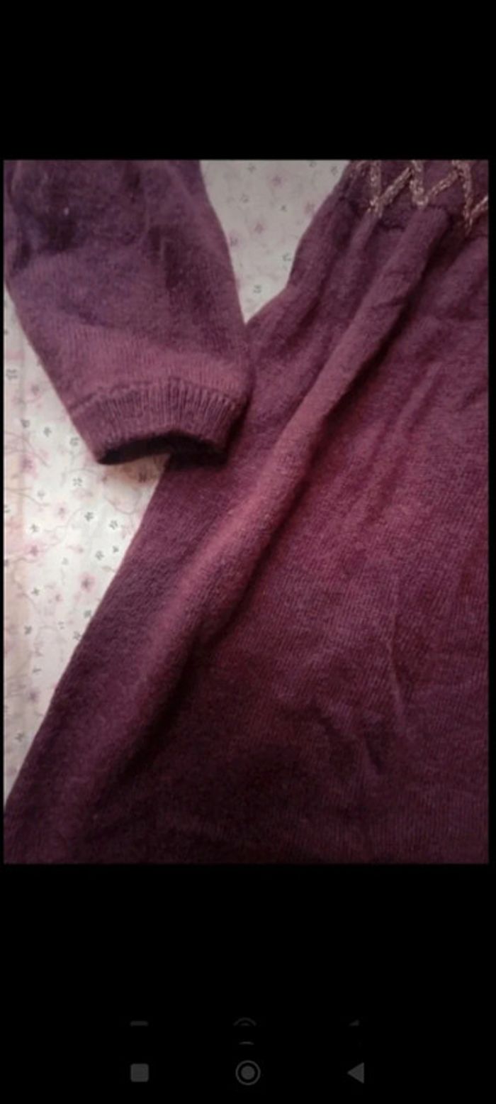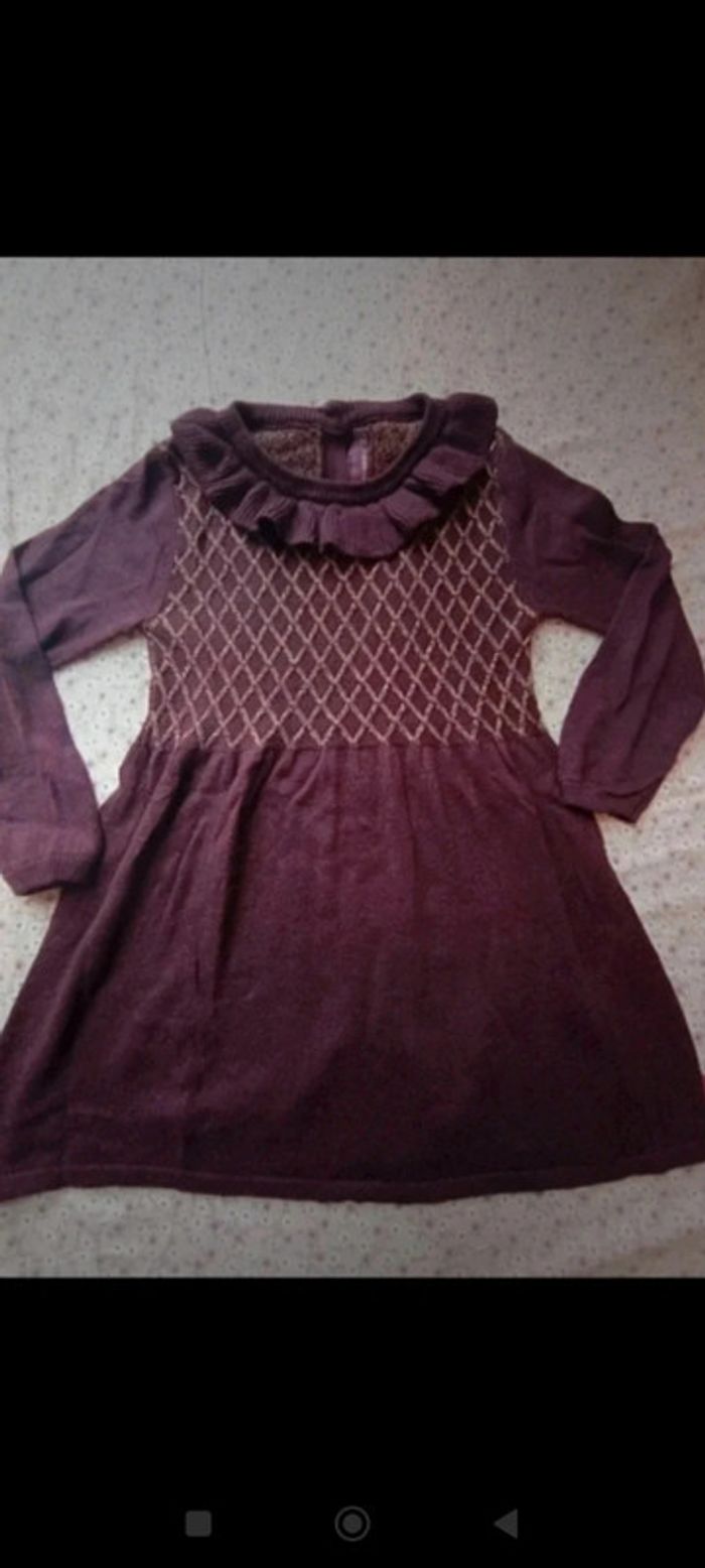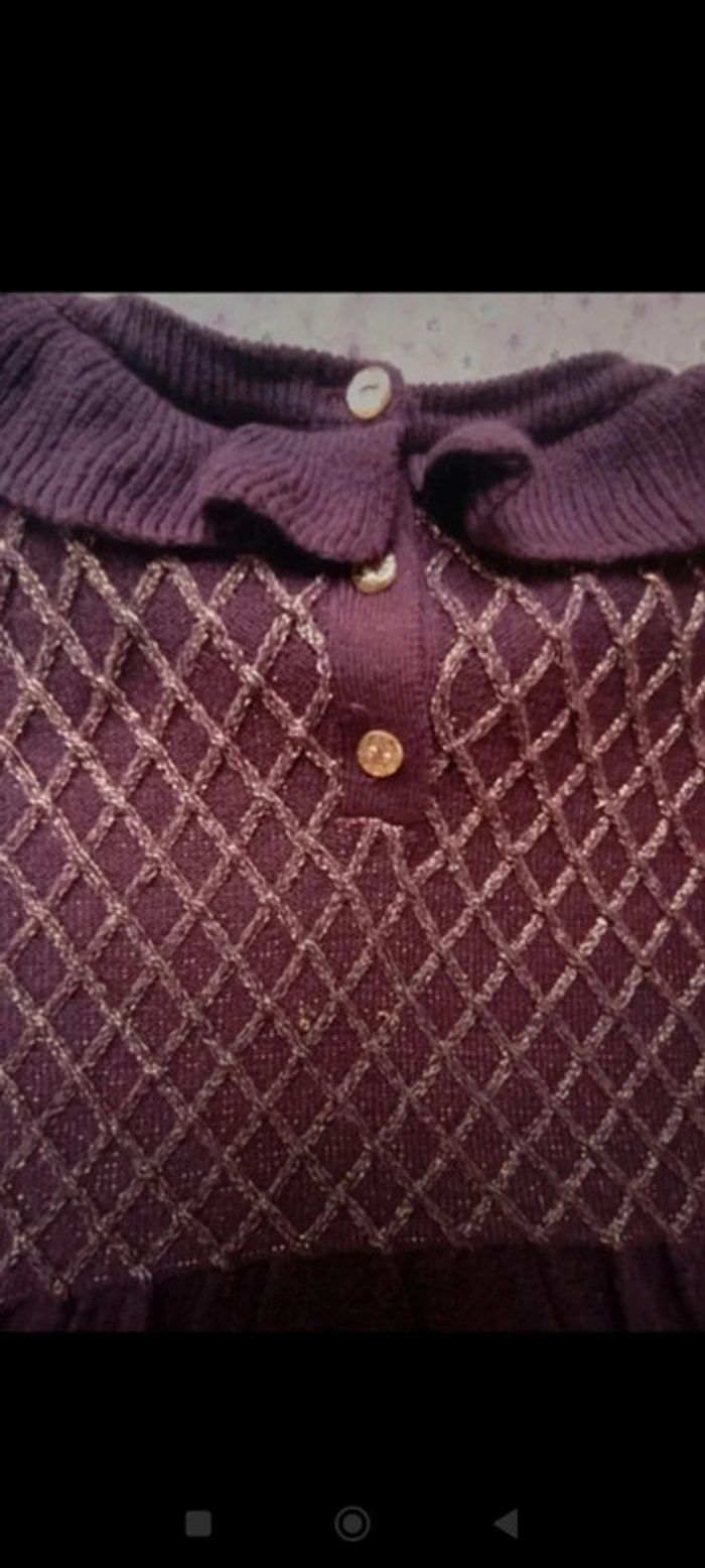Jolie robe en lainage couleur violine/lie de vin Petit col rond, broderies en fils doré sur ma poitrine, petits boutons dorés au dos #mariol69110fille3ans