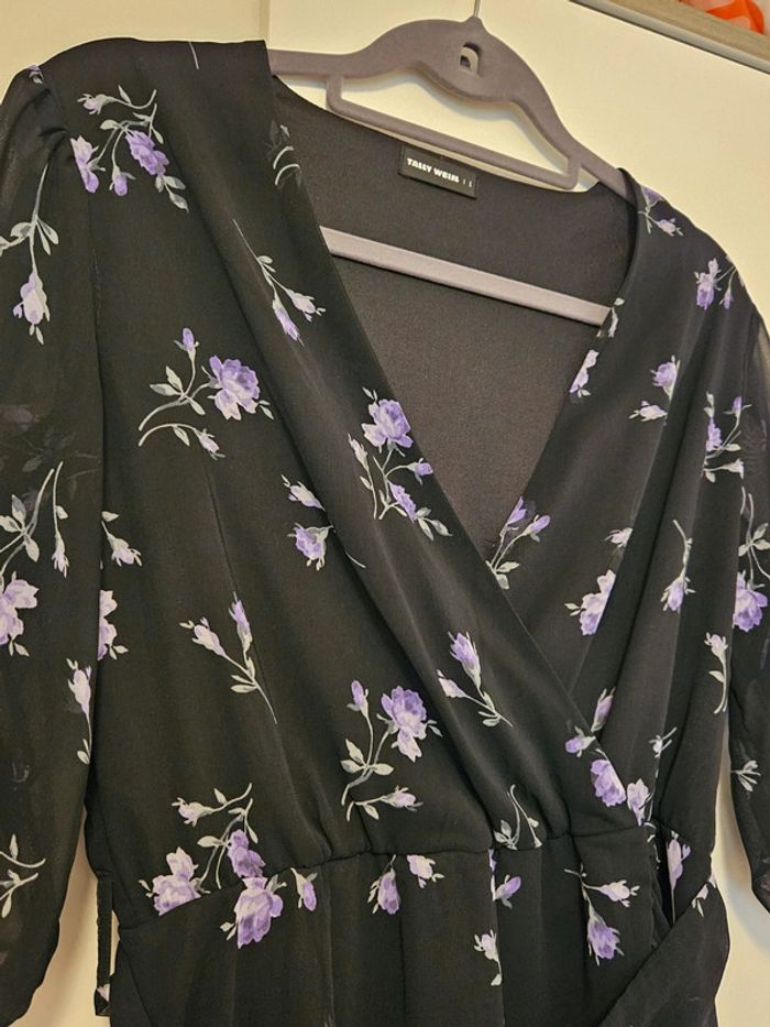 Jolie robe légère Tally Weijl Indiquée taille L, mais petit L, convient pour un 38 petit 40 Matiere voile transparent noir avec fleurs violettes Doublure noire sauf sur les manches Manches aux coudes, resserrées par un élastique Decollete cache coeur Forme type portefeuille avec pans cousus Volants sur les bas de la robe Ceinture en tissu assorti amovible Très peu portée, parfait état Esprit très rétro pin-up, portée avec une ceinture et des escarpins ! #robeportefeuille #wrapdress #overslagjurk #flowerdress #flowerprint #flores #fiori #bloemen #vintagestyle #retrostyle #pinupstyle