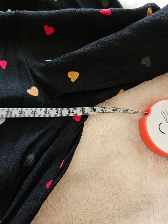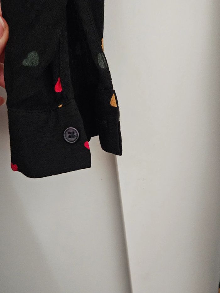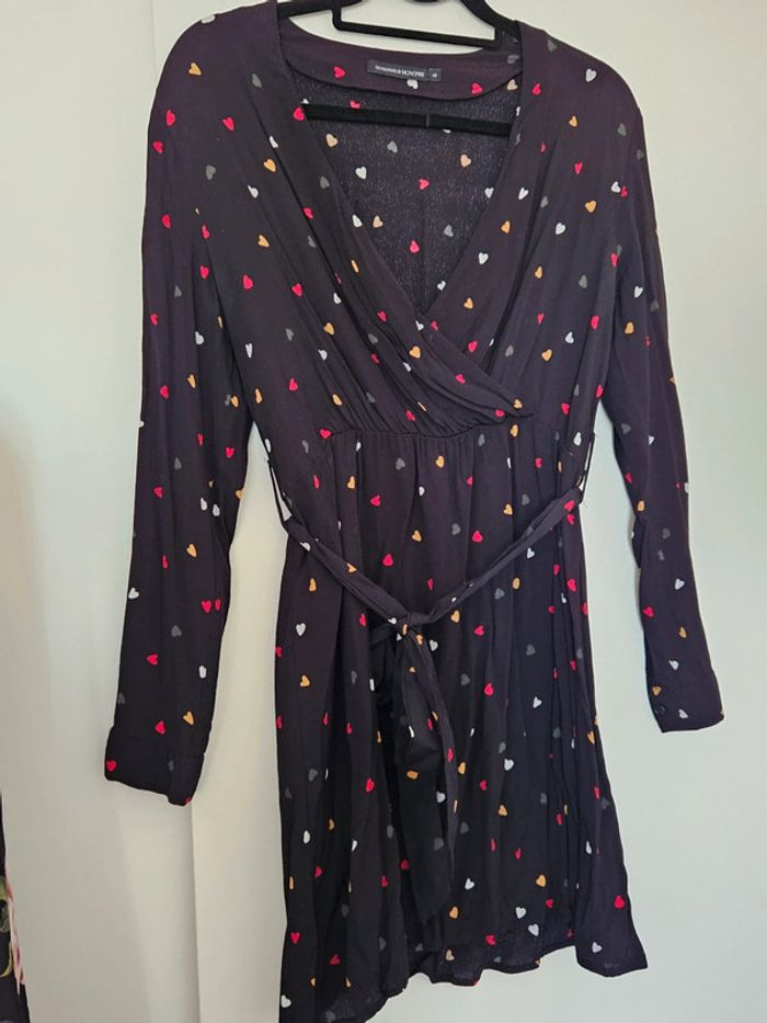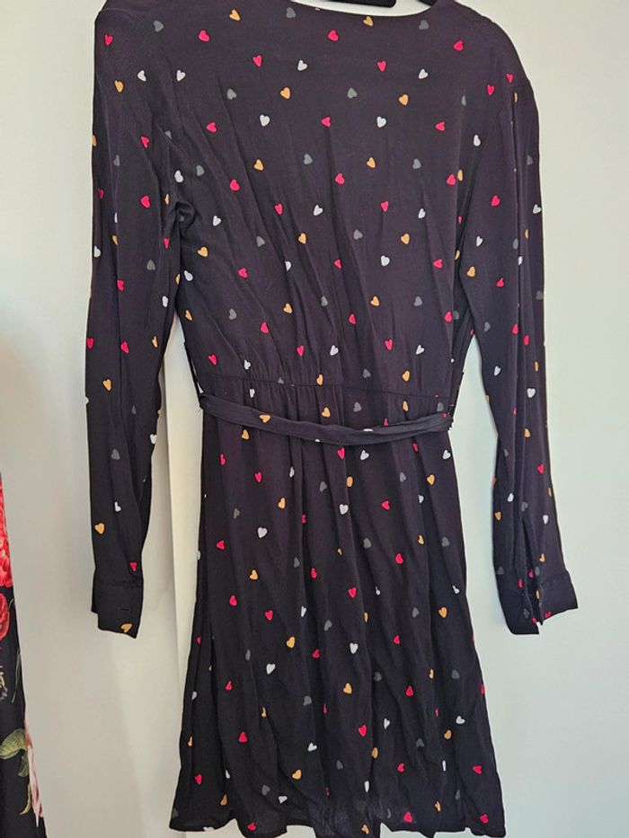 Robe légère Monoprix taille 40 (petit 40, conviendra aussi à un 38) Mesures en photo 100% viscose Décolleté forme cache coeur Manches longues avec ouverture et petit bouton sur le bas (type chemise) Ceinture assortie amovible Jupe évasée Petits cœurs colorés rouge/jaune/vert sur fond noir Parfait état ! #pinupstyle #pinuplook #retrolook #vintagelook #pinupgirl #heartprintdress #hearts #coeurs #harten #cuori