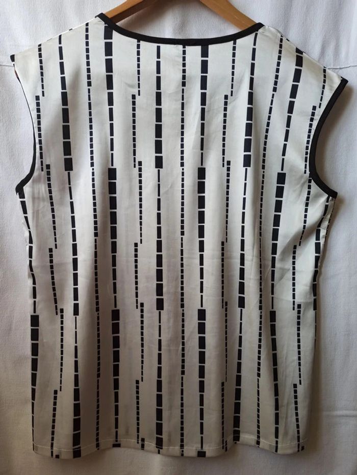 Blouse femme en très bon état en soie artificielle, peu portée. Col Rond, sans manches avec imprimé graphique. Marque Rubruan. Taille M