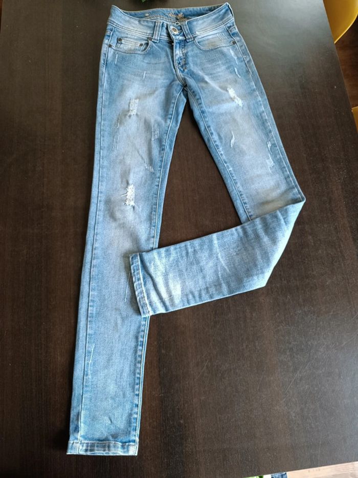 Jean BONOBO Bleu Effet used Fermé par zip & bouton 98% Coton & 2% Elasthanne TAILLE 34 TRES BON ETAT Allez voir mes autres ventes!