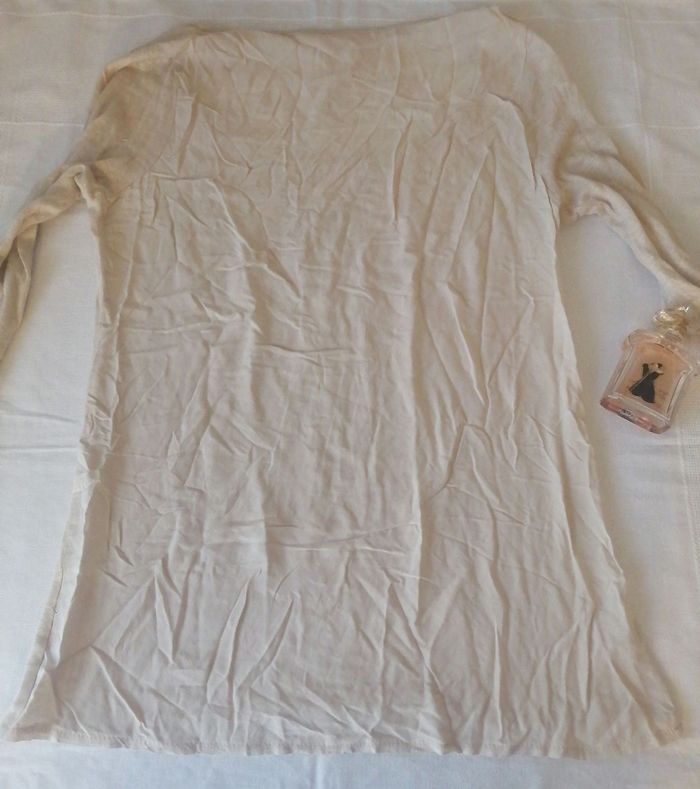T-shirt femme très fin à manche longues il n'y a pas l'étiquette de la taille, on voit à travers le tissu au niveau du dos