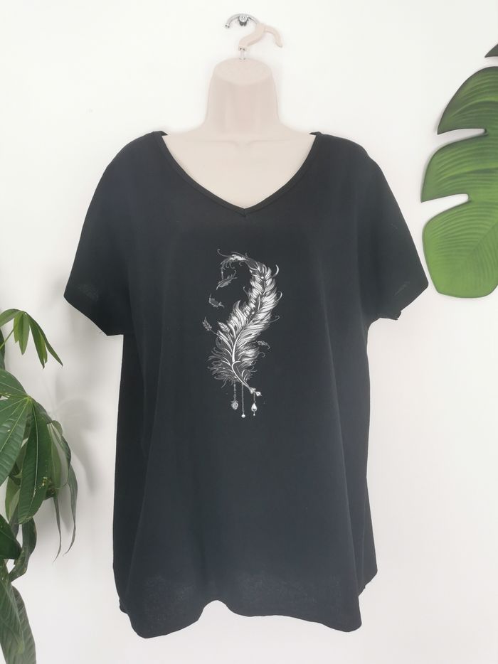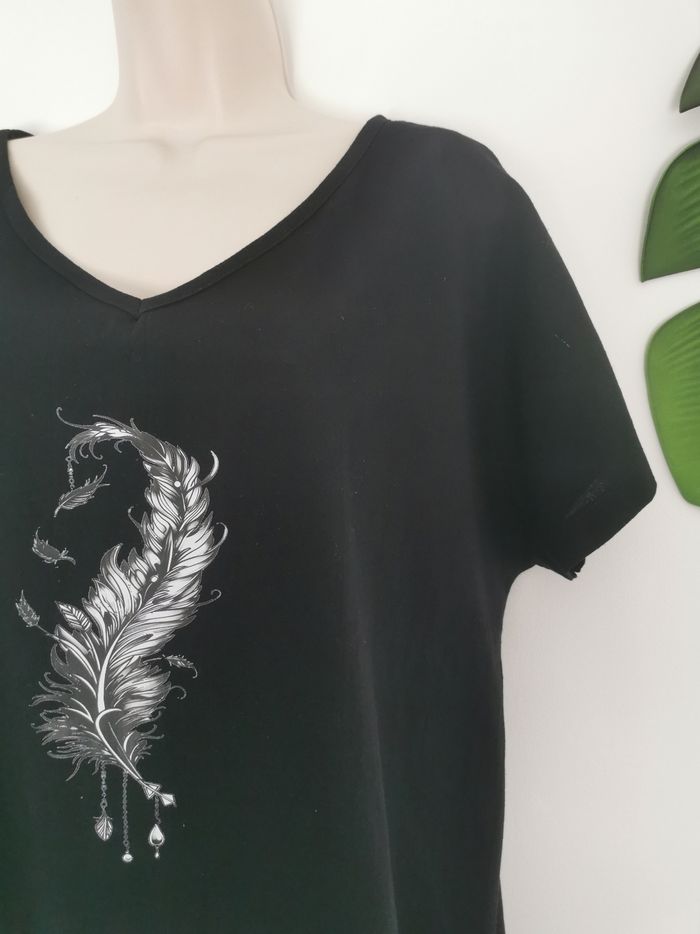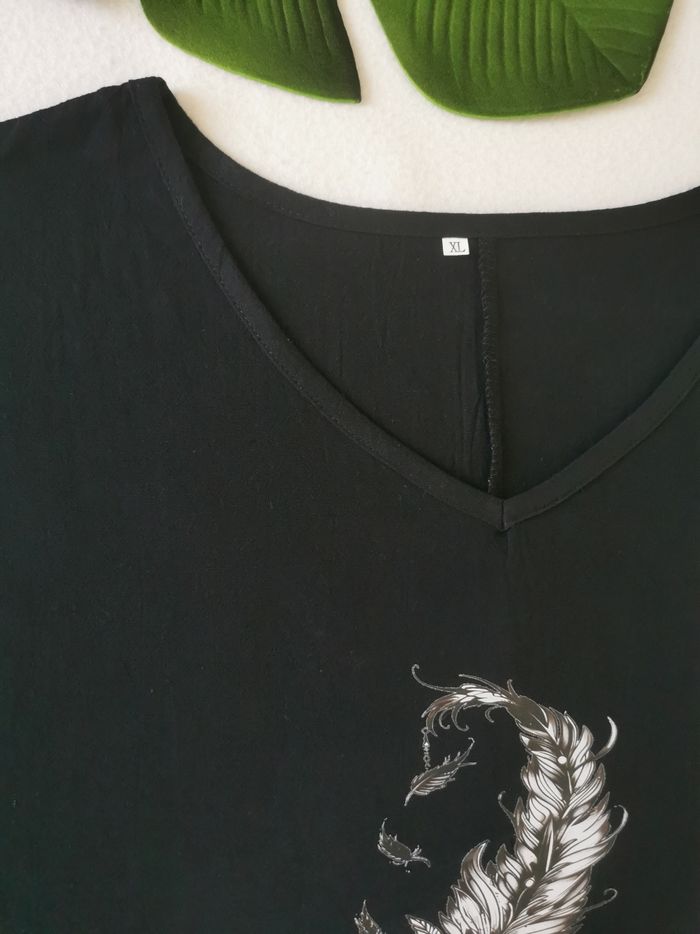 🙎‍♀️ ÉTAT DE L'ARTICLE: 10/10 ✅️ Sans étiquette, jamais porté 📷 Photo portée du site disponible en message privé 📷 Tee-shirt noir 👩 Taille XL • Matière: 100% coton • Tissu texturé • Coupe ample décontractée • Col en V • Manches courtes • Motif plume 🪶 à l'avant • Couleur: Noir ⚫️ • 📏 Longueur: 74 cm • 📏 Mesure sous aisselles: 58 cm Parfait état👌, jamais porté 📎