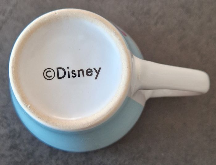 Tasse représentant Minnie Mouse, multicolore mais à dominante bleu ciel, forme évasée, en céramique. A peut-être été utilisée (pas sûr) mais état neuf.