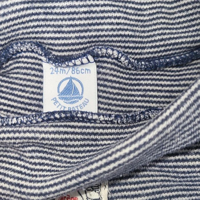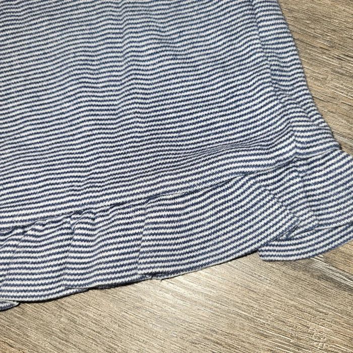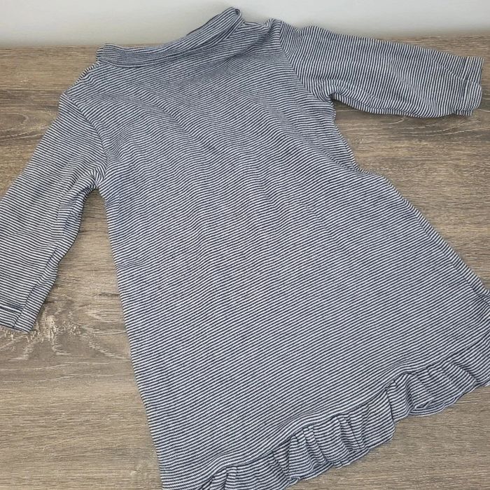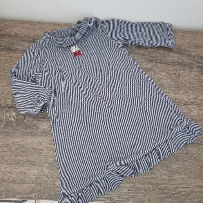 Petit Bateau Taille 24 mois / 86 cm Robe en coton jersey epais rayé marine et blanc Petits volants au bas de la robe Col légèrement montant Fermé par pressions sur l épaule Très bon état