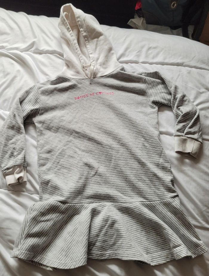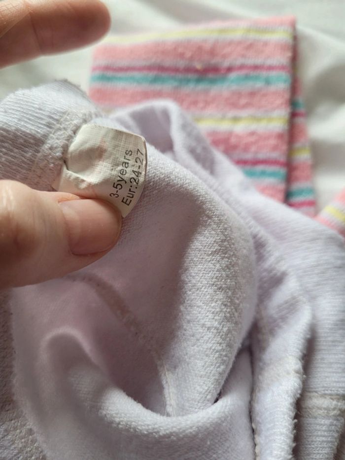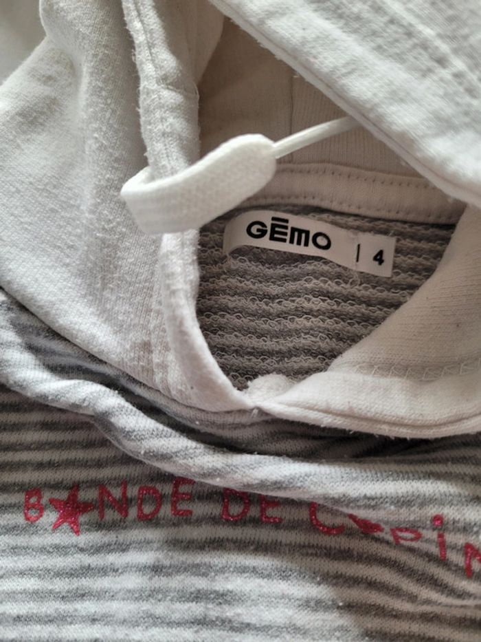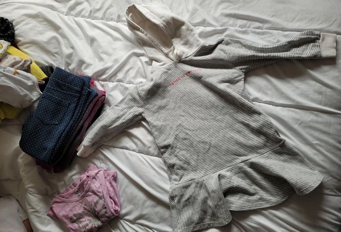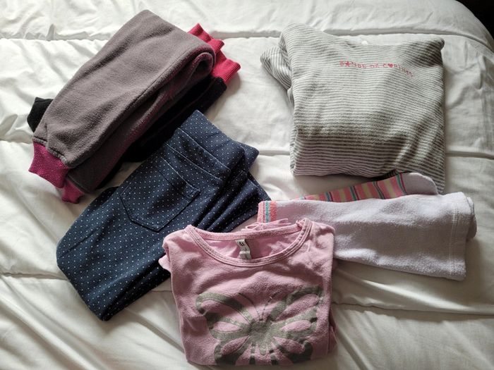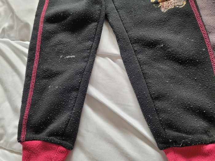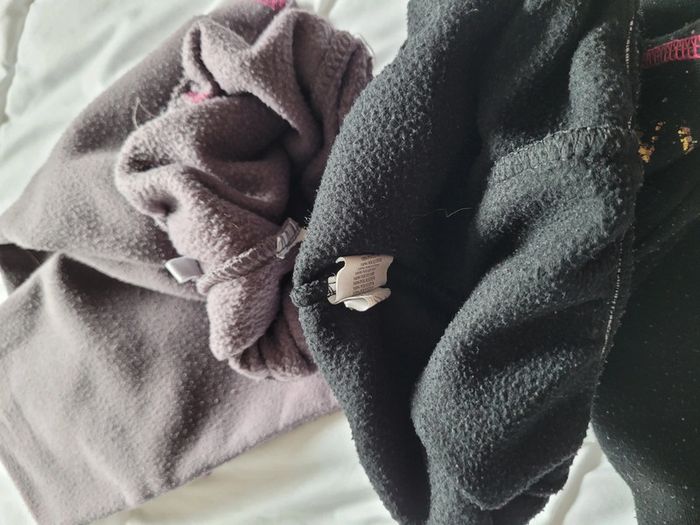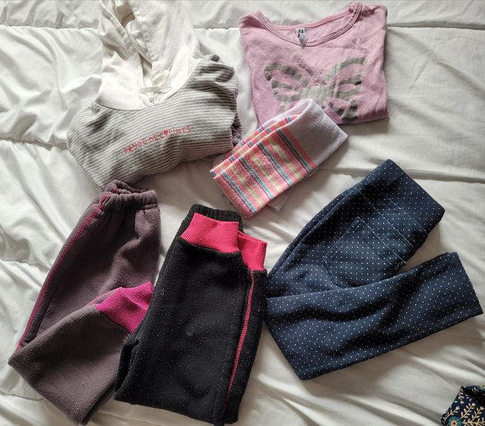 Petit lot d'habits imparfaits en taille 4 ans. Jouer sans se soucier de les abîmer plus... - 2 joggings bien chauds Disney marron et noir. Le noir a des tâches de colle ? Ils ont été bien portés des bouloches mais idéal lors des sorties dans la nature. - 1 legging chaud okaidi bleu marine à pois blancs. Il est usé troué aux 2genoux. Il est réparable ou à porter tel quel. - 1 robe à capuche gemo. Rayé blanche et grise. Bouloches, tâche marron sur une manche, tâches de feutre bleu sur le haut. - 1 t-shirt rose à manches longues, tâche légère et bouloches. - 1 paire de collants blancs avec rayures. Pas de trou ni tâche mais un accroc sur toute la longueur. #T4ans_baptlily -> j'ai d'autres lots de ce style pour les autres saisons.