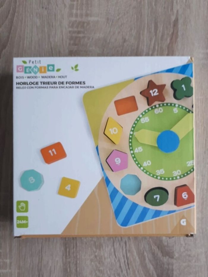 Vends horloge éducative et formes à encastrer Petit génie Horloge et formes en bois Grâce à cette horloge en bois votre enfant apprendra à lire l'heure de façon ludique dès son plus jeune âge. A travers ce jeu éducatif, les formes et les chiffres se mêlent eux aussi à l'apprentissage. Chaque chiffre correspond à une pièce à encastrer aux formes variées et colorées. Grâce à elle, les enfants pourront se familiariser avec les chiffres, les formes, les couleurs puis avec un peu d'entraînement réussiront à déchiffrer l'heure de l'horloge ! Prépare à l'entrée à l'école Stimule la mémoire de l'enfant Développe sa motricité fine et la dextérité. Favorise la reconnaissance des formes et des chiffres Dimensions: 22x6x22 cm A partir de 3 ans prix neuf 15€ NEUF 1 coin de la boite de transport est très légèrement abîmée d'origine ( voir photos )