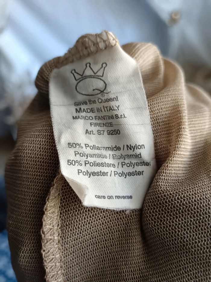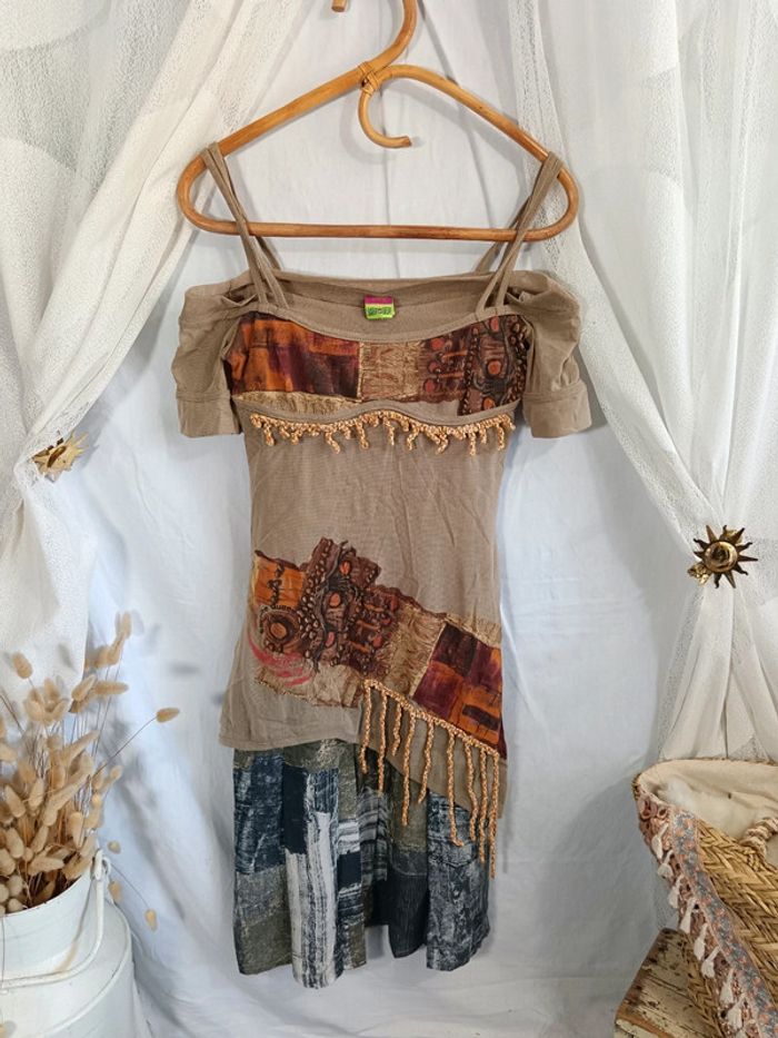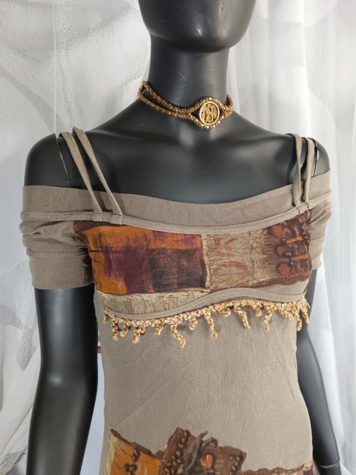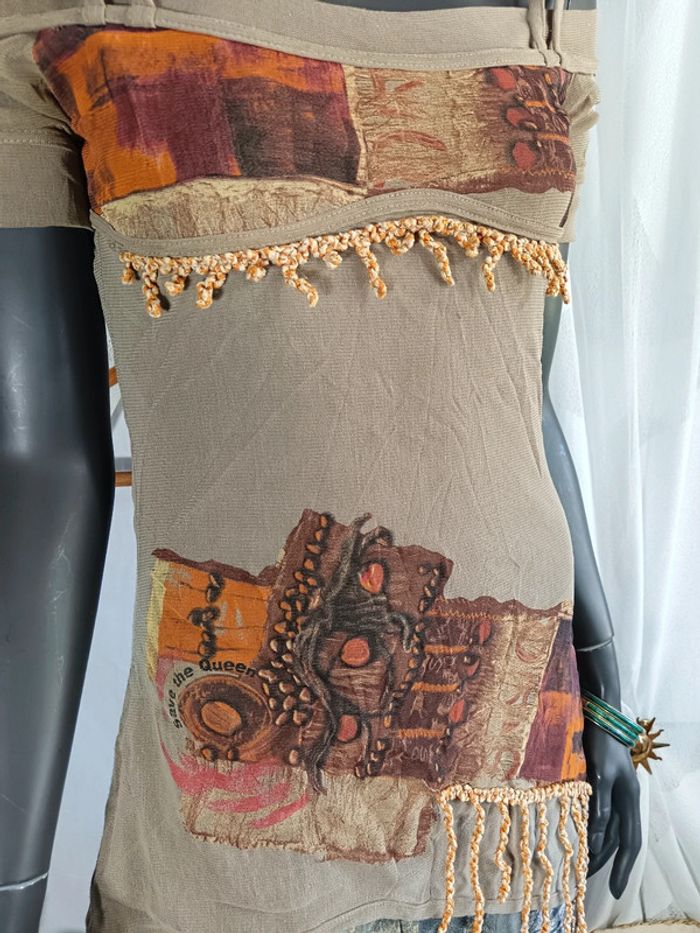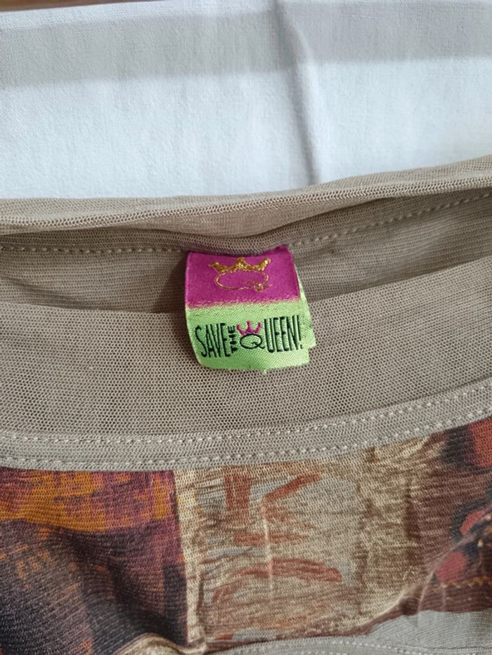 Robe mesh Save The Queen Taille S Les épaules à bretelles et prolongement en bateau sur le bras. Le haut en mesh est en tissus mesh doublé, donc transparence, transparence estompé par le décor marron Decor garniture de frange. Le bas bleu crème Longue de 100cm #calm36 #calm34 #robemesh