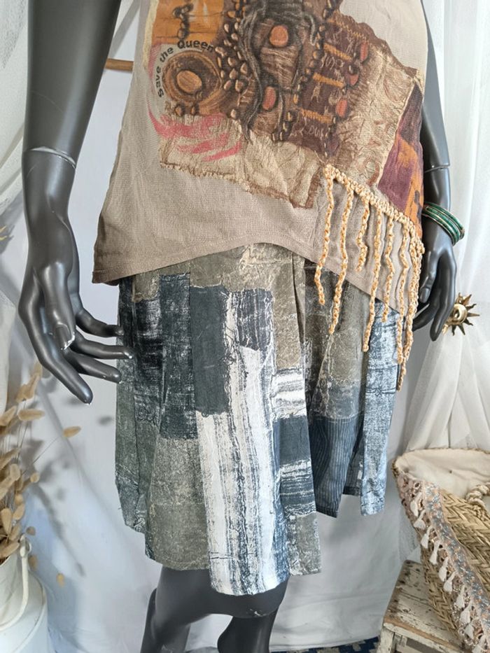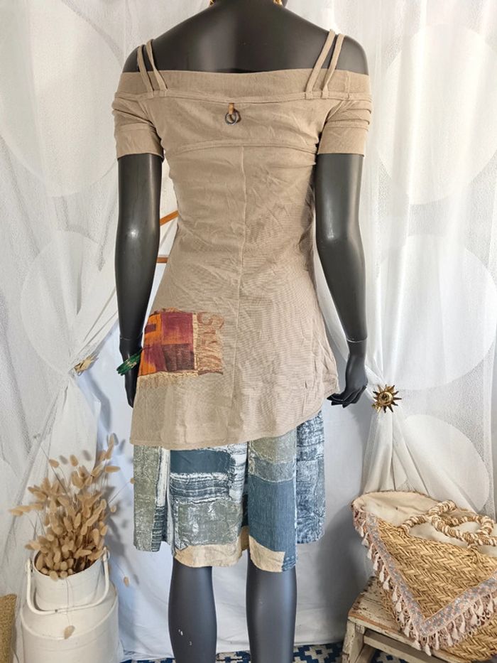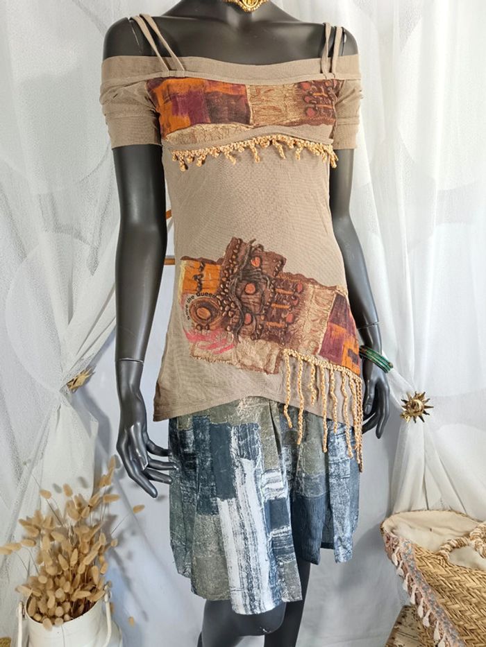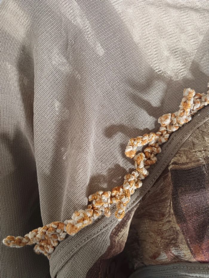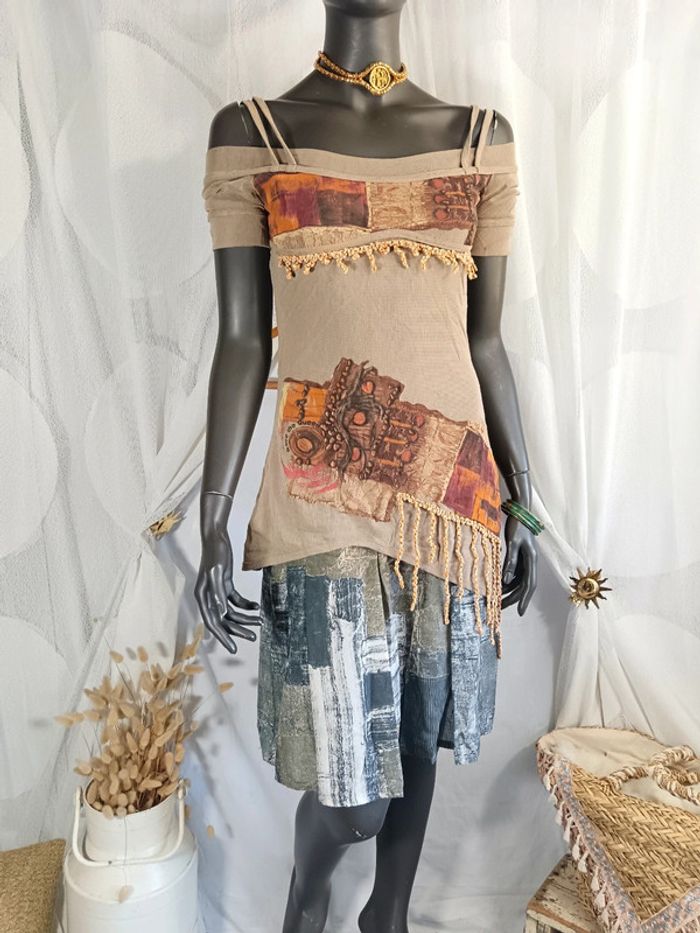 Robe mesh Save The Queen Taille S Les épaules à bretelles et prolongement en bateau sur le bras. Le haut en mesh est en tissus mesh doublé, donc transparence, transparence estompé par le décor marron Decor garniture de frange. Le bas bleu crème Longue de 100cm #calm36 #calm34 #robemesh
