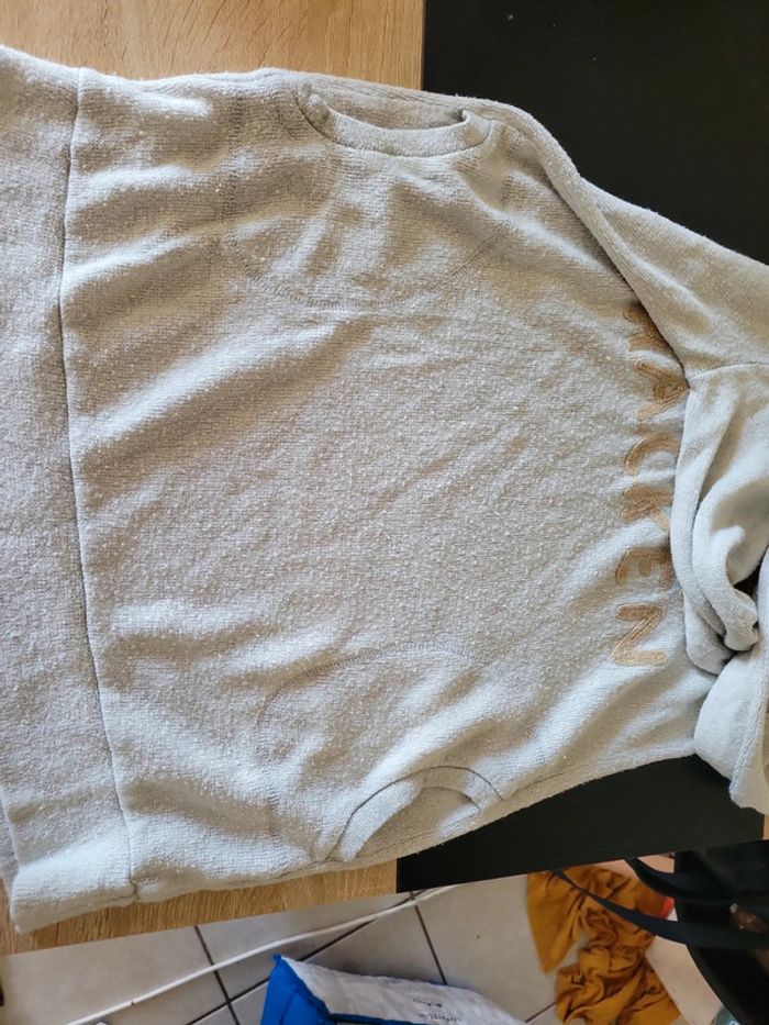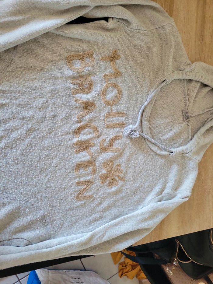 Pull léger à capuche gris avec poche. Très agréable à porter, doux et confortable ideal pour les soirées d'été mais fait un peu de bouloche. Taille L