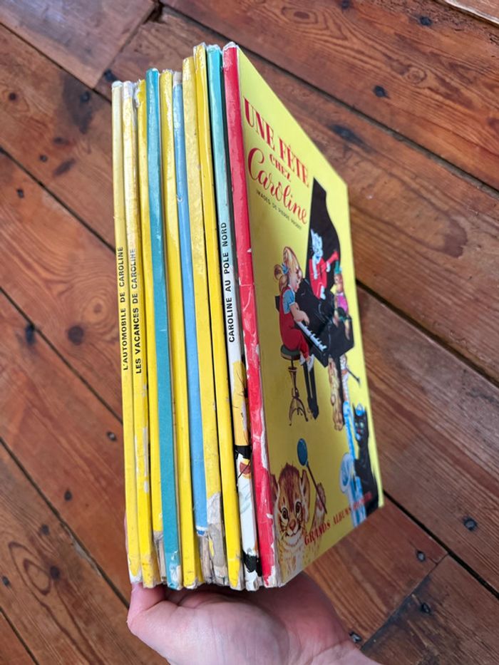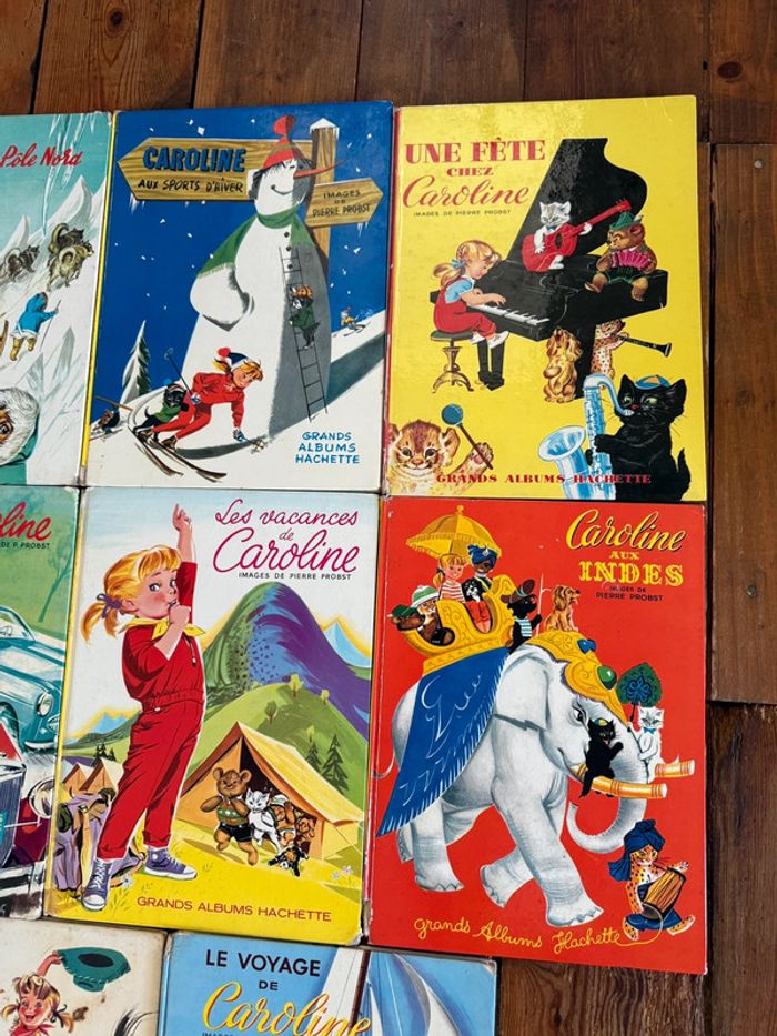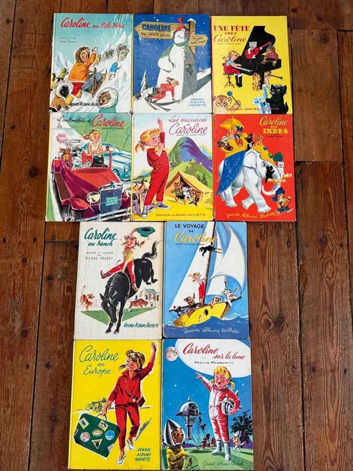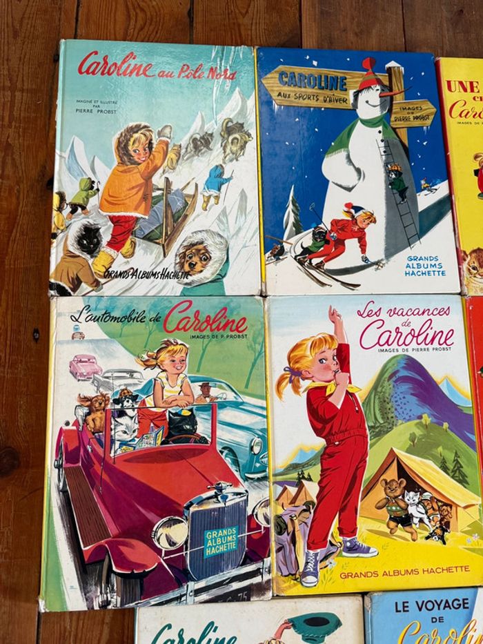 Lot d’ouvrages COMPLETS et en BON ÉTAT pour des bd de plus de 60 ans (ce sont les premières éditions de ces livres Caroline à l’humour incroyable et aux illustrations à pleurer de beauté et d’émotion). 🙏☺️ Lot non dissociable et non négociable comportant les titres suivants : Caroline au Pôle Nord Caroline aux sports d’hiver Une fête chez Caroline L’automobile de Caroline Les vacances de Caroline Caroline aux Indes Caroline au ranch Le voyage de Caroline Caroline en Europe Caroline sur la Lune