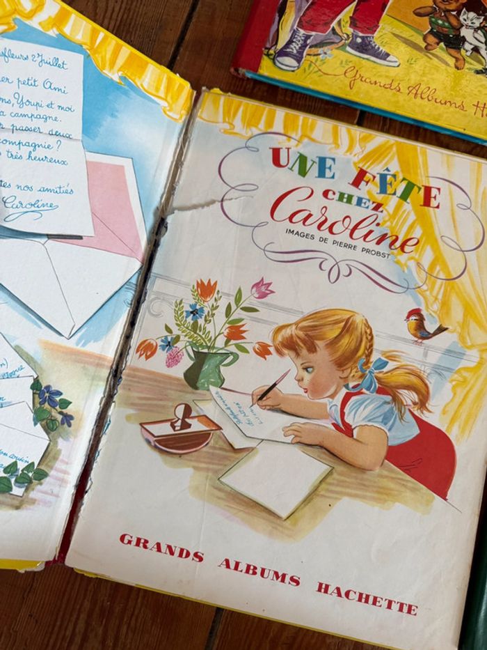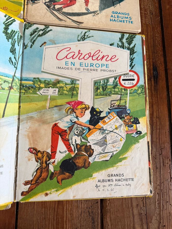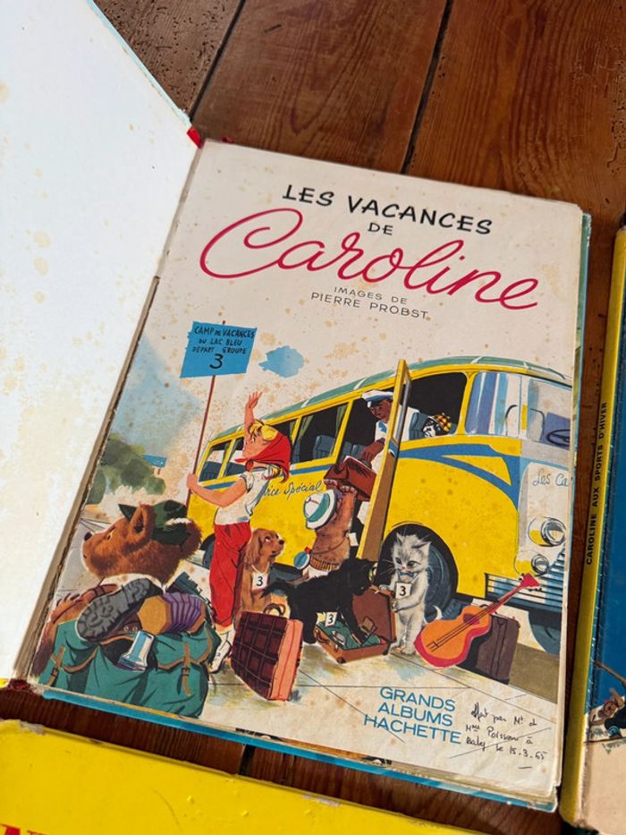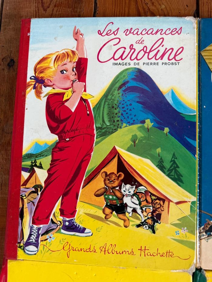 Ces livres sont les éditions les plus anciennes des aventures bd de Caroline avec Pierre Probst, très anciens (ils ont plus de 60 ans), et superbes illustrations. Ils sont COMPLETS et en état SATISFAISANT MOYEN cf photos. Lot non négociable comprenant : Les vacances de Caroline Caroline aux sports d’hiver Une fête chez Caroline (invite ses amis) Caroline voyage en Europe