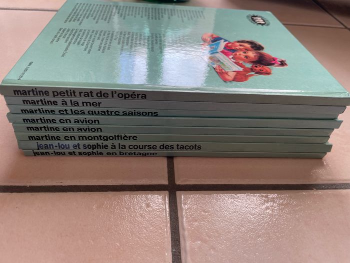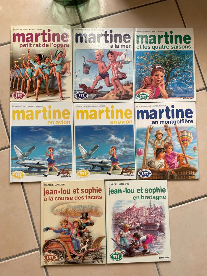 Livres collection farandole Casterman: - Martine petit rat de l’opéra, -Martine à la mer, - Martine et les quatre saisons, - Martine en avion (x2), - Martine en montgolfière, - Jean- Lou et Sophie à la course des tacots, - Jean-Lou et Sophie en Bretagne. Années 80 L’unité 6 euros 5 euros à partir de 3 25 euros les 8