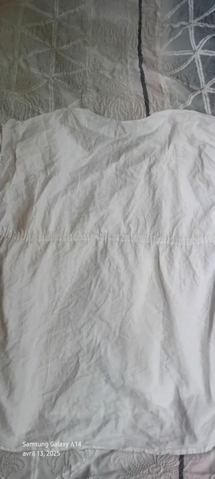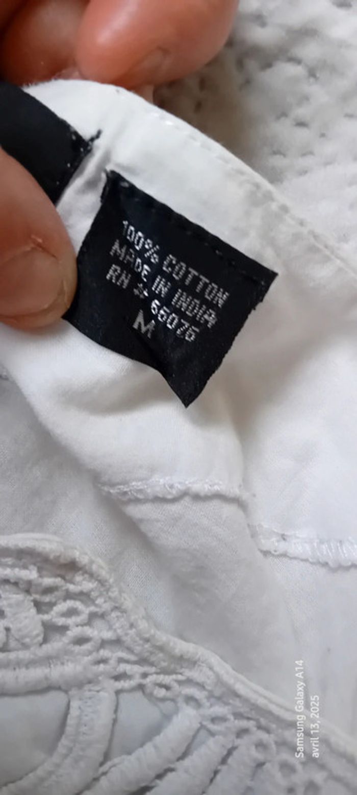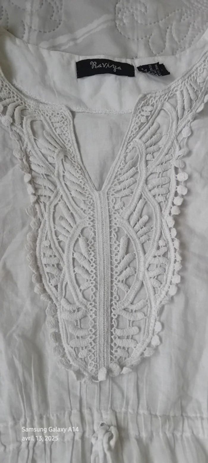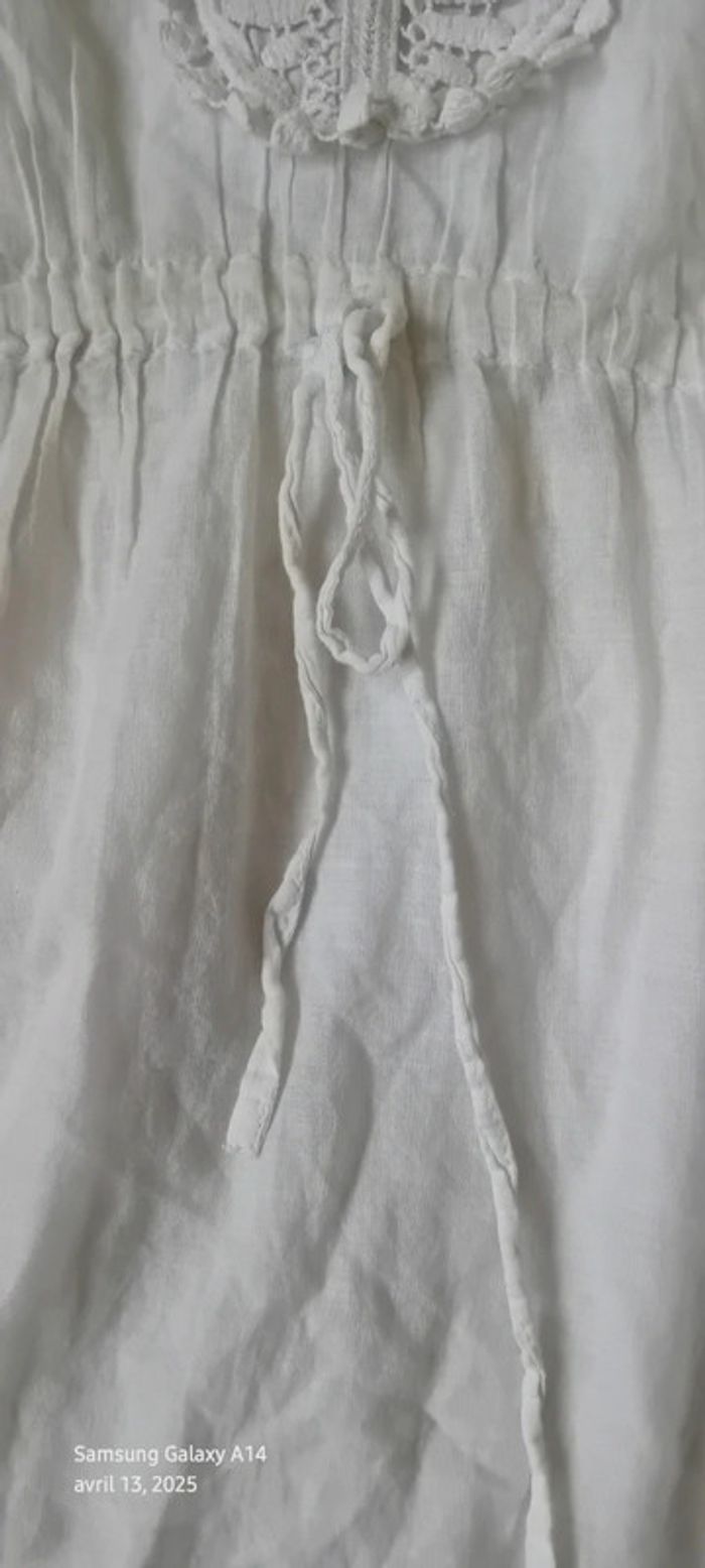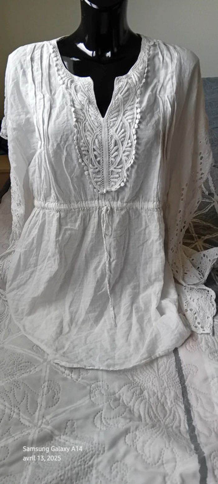 Blouse longue style hippie en coton coupe large avec manches très courtes large avec dentelle ajourée broderies sur le devant lien à nouer à la taille longueur 75 cm largeur aisselles à aisselles 48 cm largeur épaules 50 cm fabriqué en Inde taille M 38 très peu porté en très bon état #midole #midolefemme #midolefemme38 #hautfemme38 #femme38 #blousefemme38 #blouseavecdentelle38 #blouse avecbroderies #dentelle #broderies #raviya #bohème #hippie