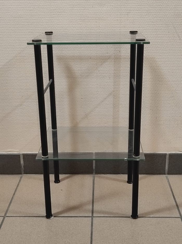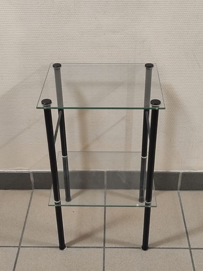 Table d'appoint, bout de canapé ou porte plante des années 50. Deux plateaux en verres et structure en métal noire. Quelques marques du temps ( micro rayures ). Dimensions Hauteur 59,5 cm Largeur et longueur 35x29.