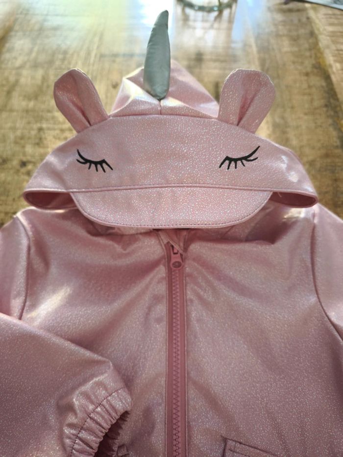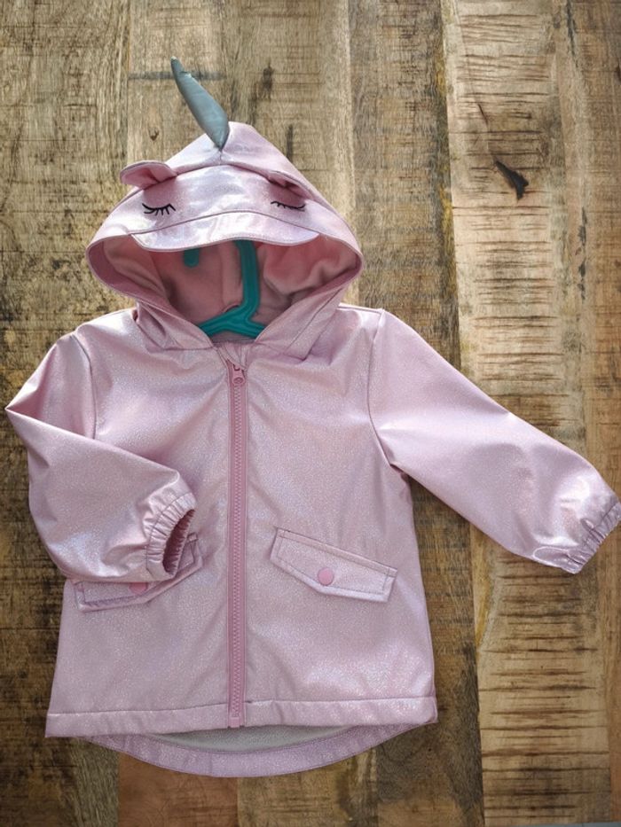 Veste mi saison, intérieur polaire, capuche licorne, couleur rose avec paillettes. Taille 12/18 mois 86cm (taille grand).