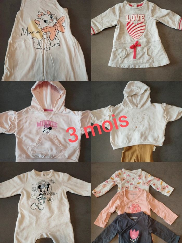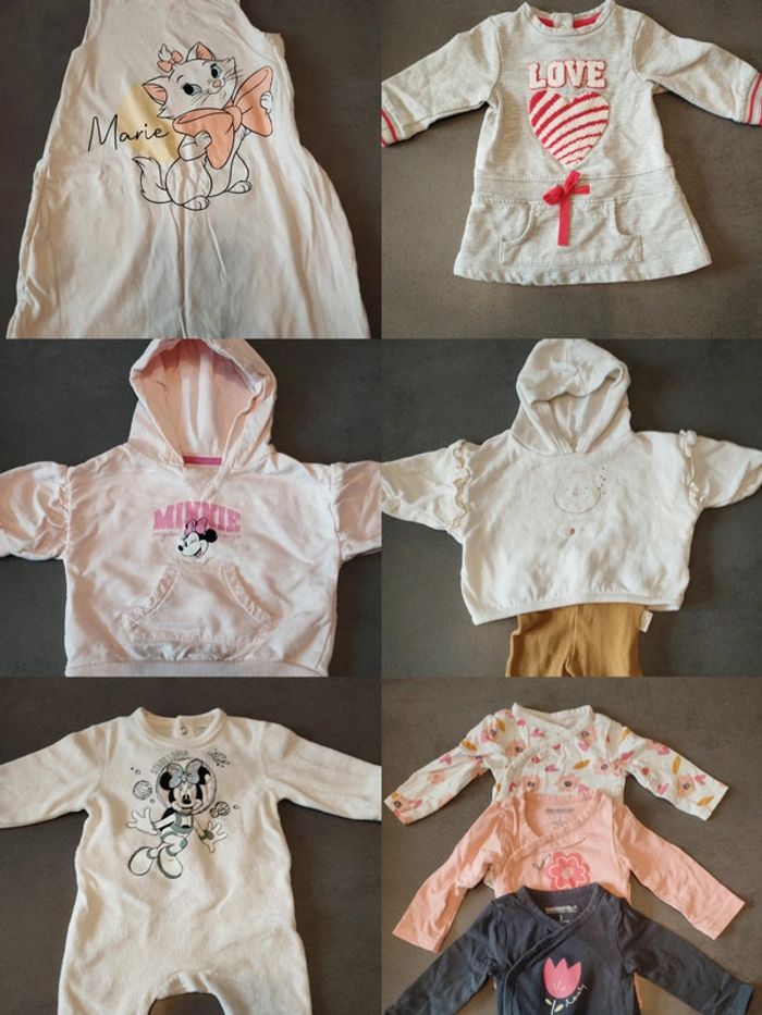 3 bodys Un ensemble Winnie Un sweat capuche Minnie état neuf Une robe Un pyjama Une turbulette 0/6 mois orchestra, Disney