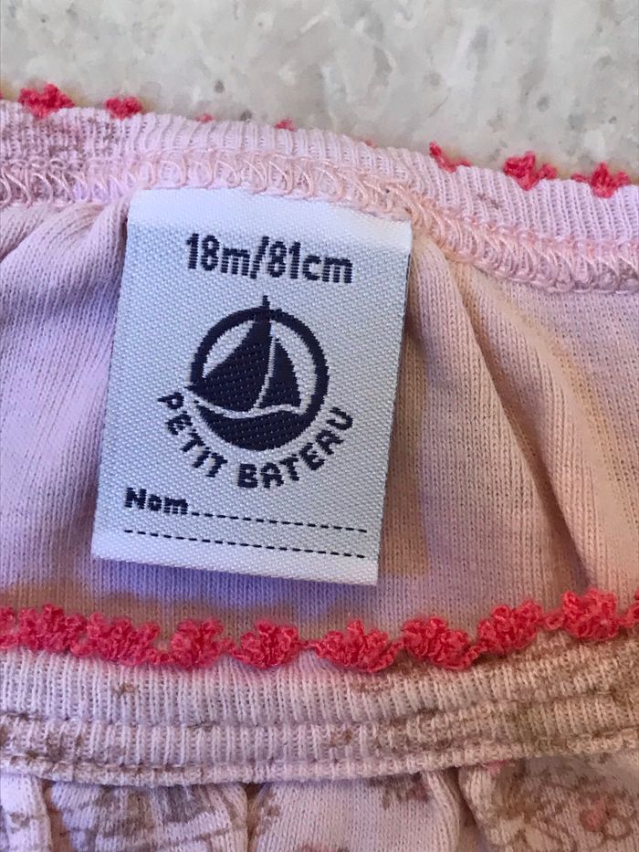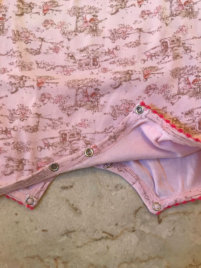 Combinaison bébé courte à bretelles Ouverture pressionnée à l’entrejambe pour faciliter l’enfilage Galon fantaisie autour des bretelles, de l’encolure et autour des jambes Composition : 100% coton Couleur : rose avec impressions brunes Très bon état Taille : 18 mois Marque : PETIT BATEAU